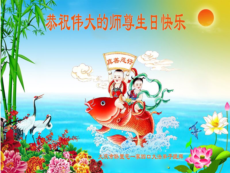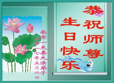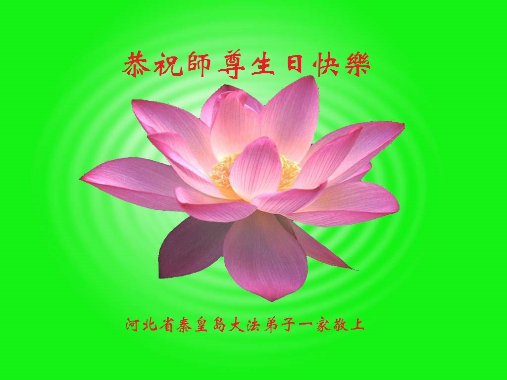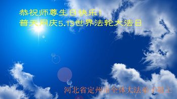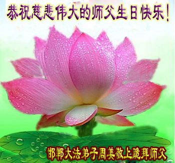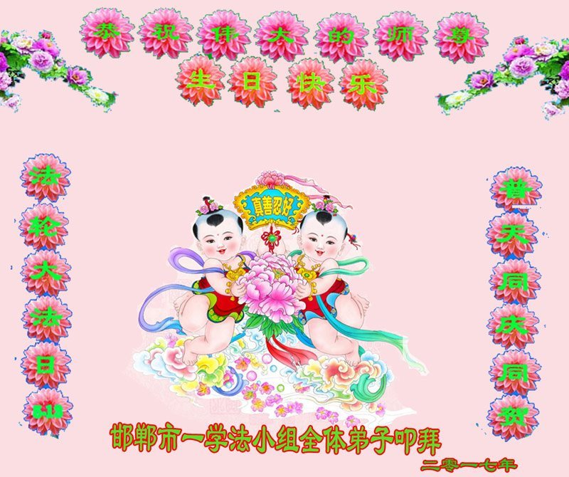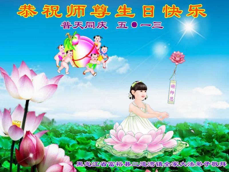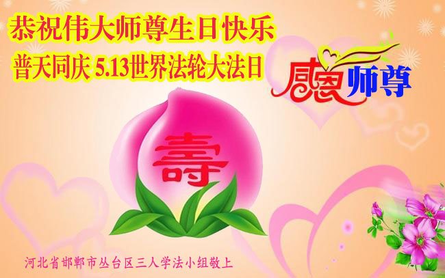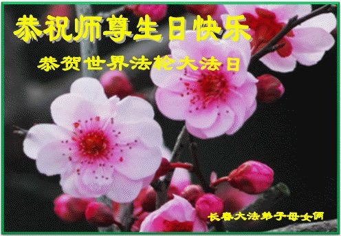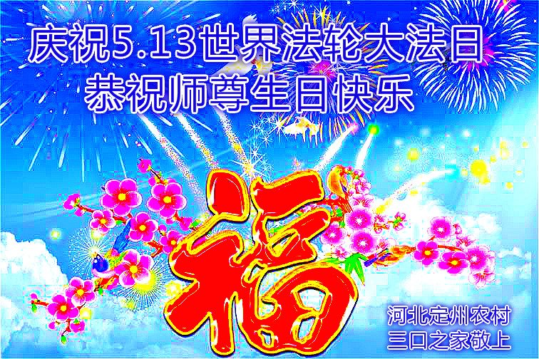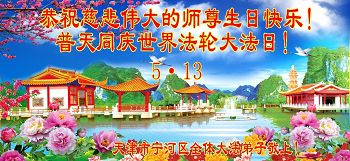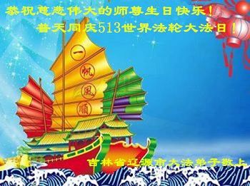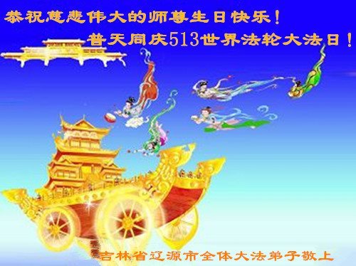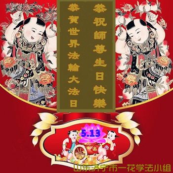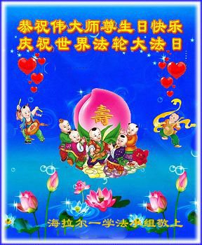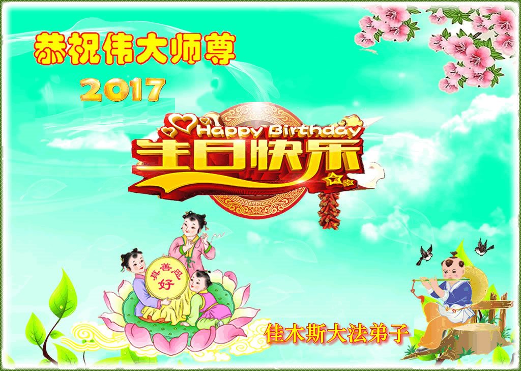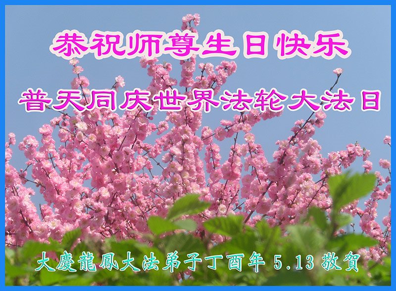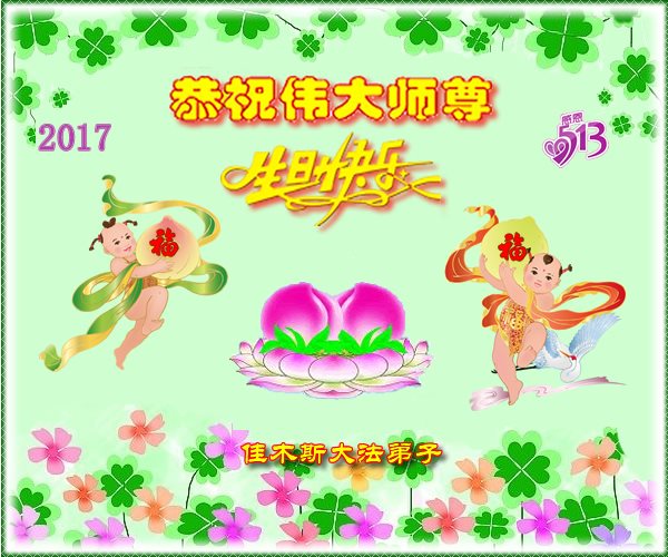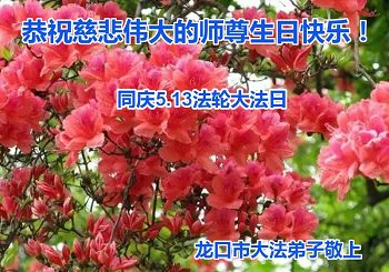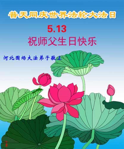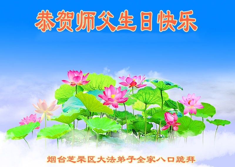 在五一三这个普天同庆队伟大时刻,我和我的家人在此恭祝:恭祝慈悲伟大的师尊生日快乐!为了芸芸众生得救,师父,您辛苦了!在此也祝贺:法轮大法洪传二十五周年!