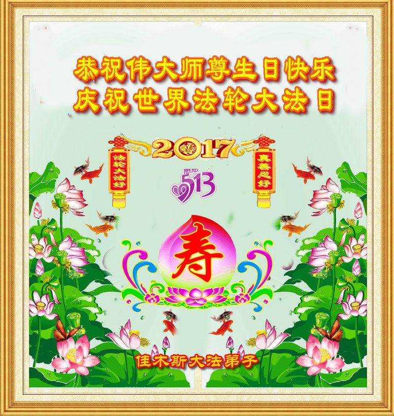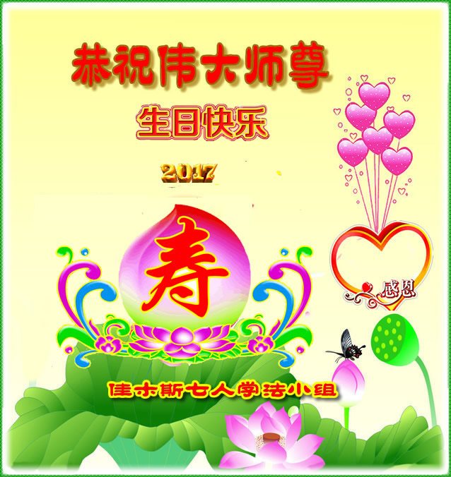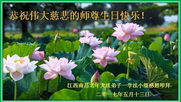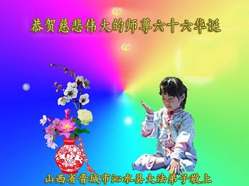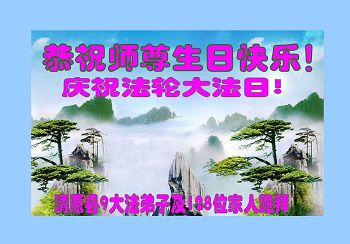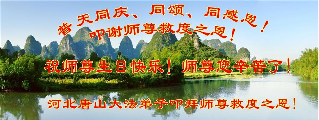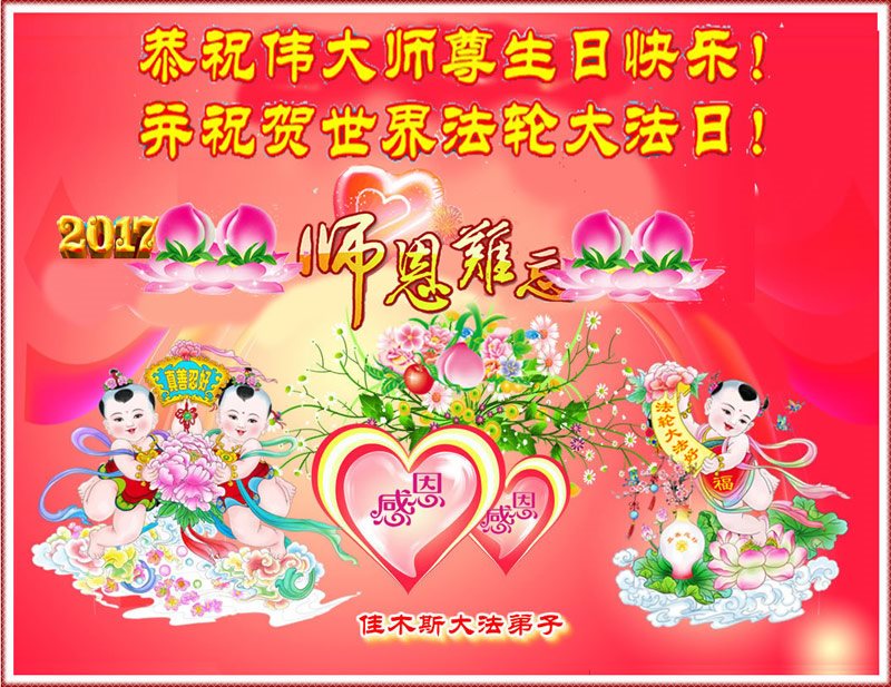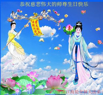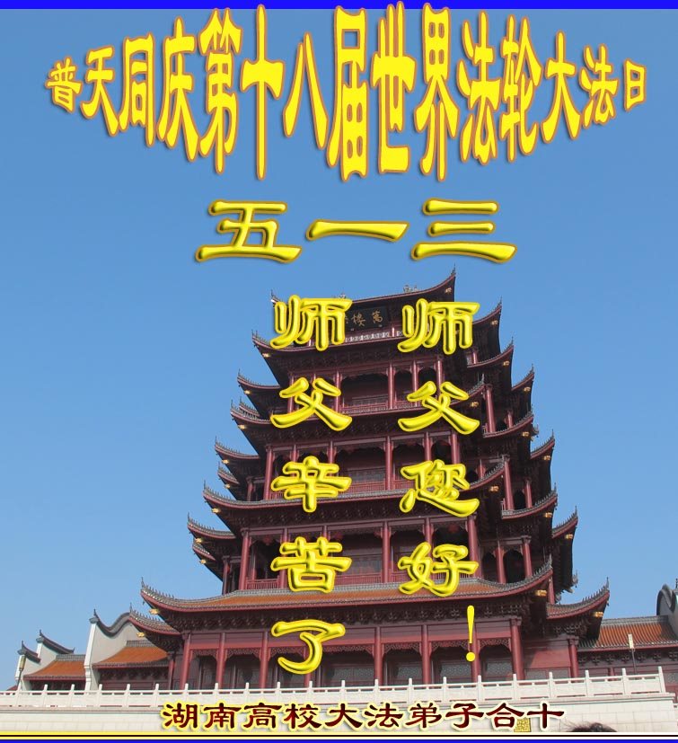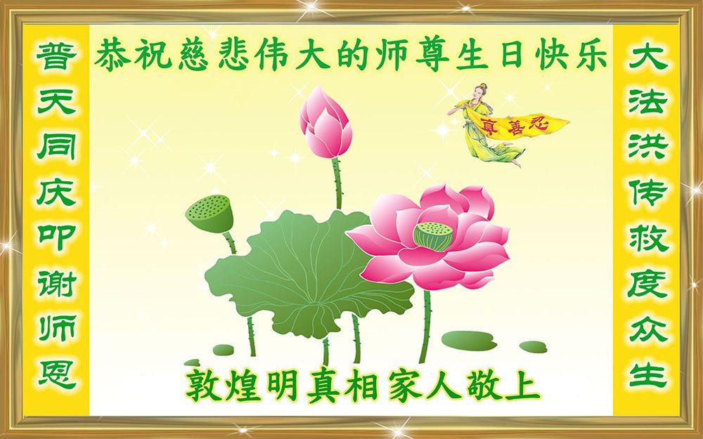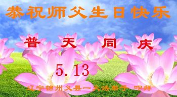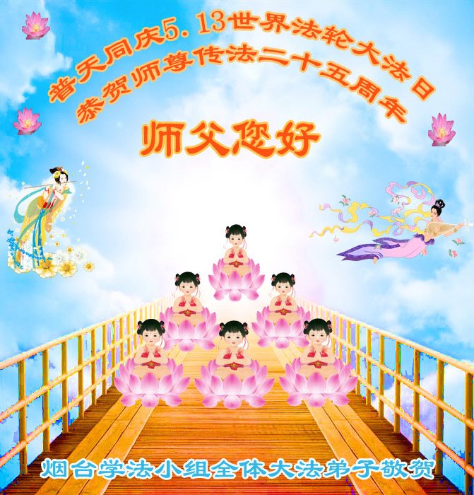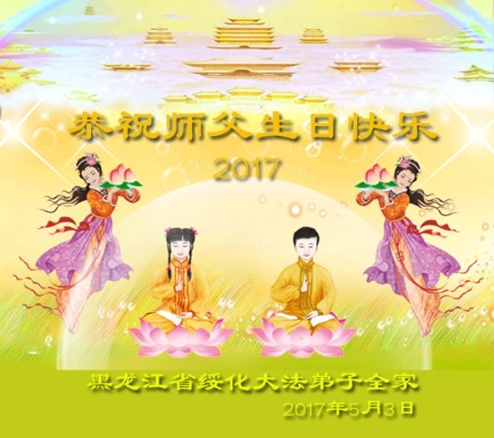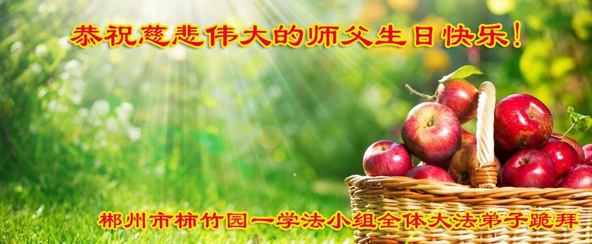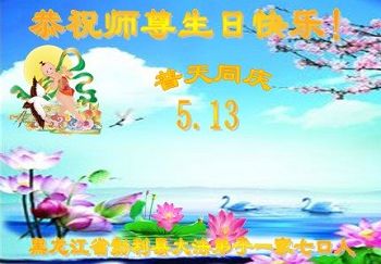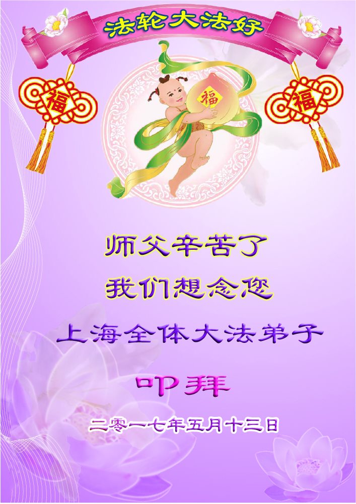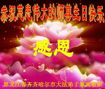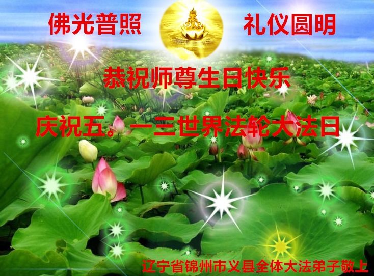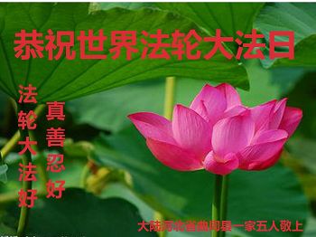 在五一三这个普天同庆队伟大时刻,我和我的家人在此恭祝:恭祝慈悲伟大的师尊生日快乐!为了芸芸众生得救,师父,您辛苦了!在此也祝贺:法轮大法洪传二十五周年!