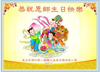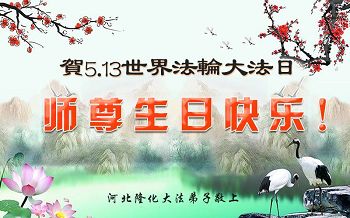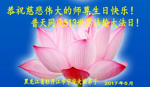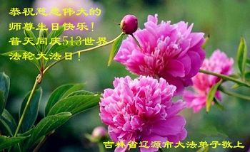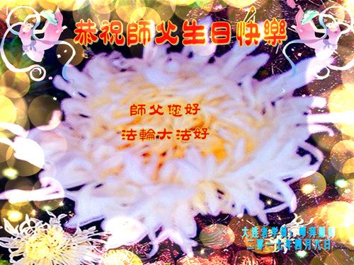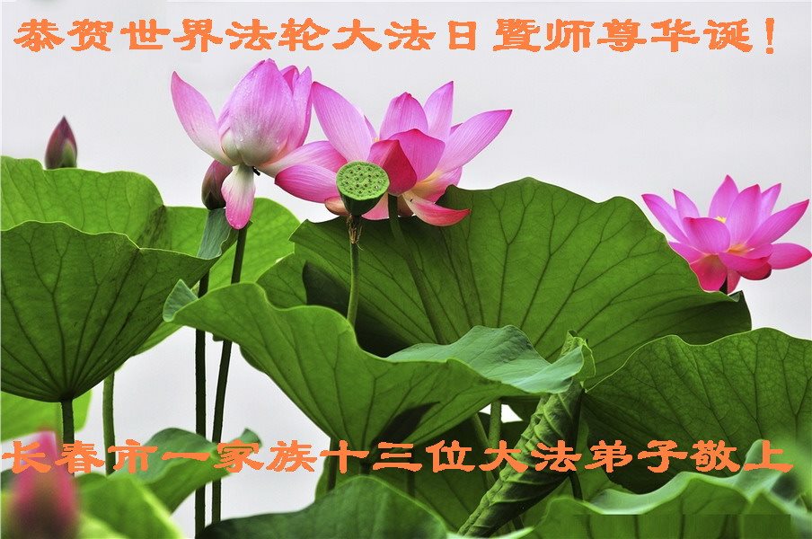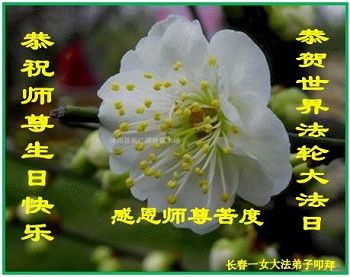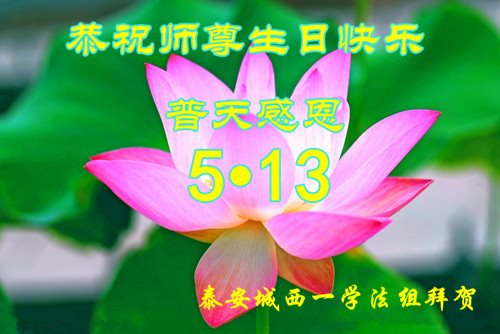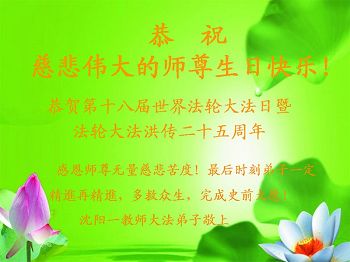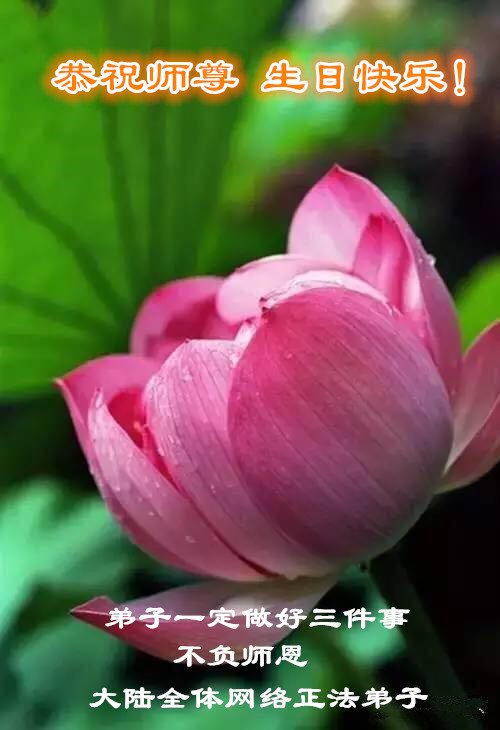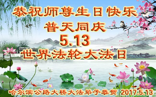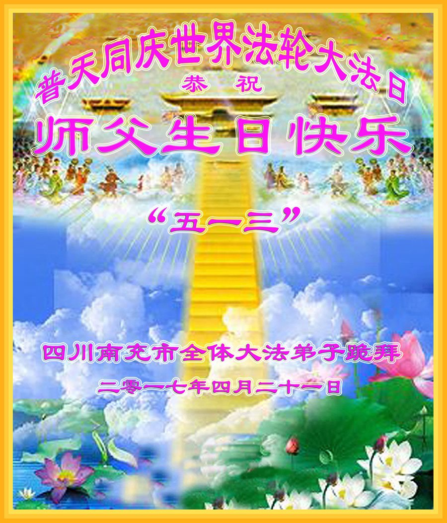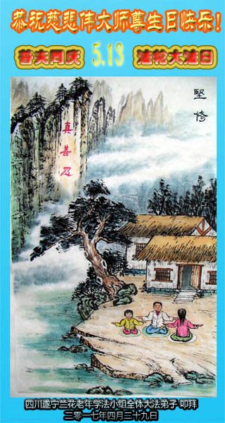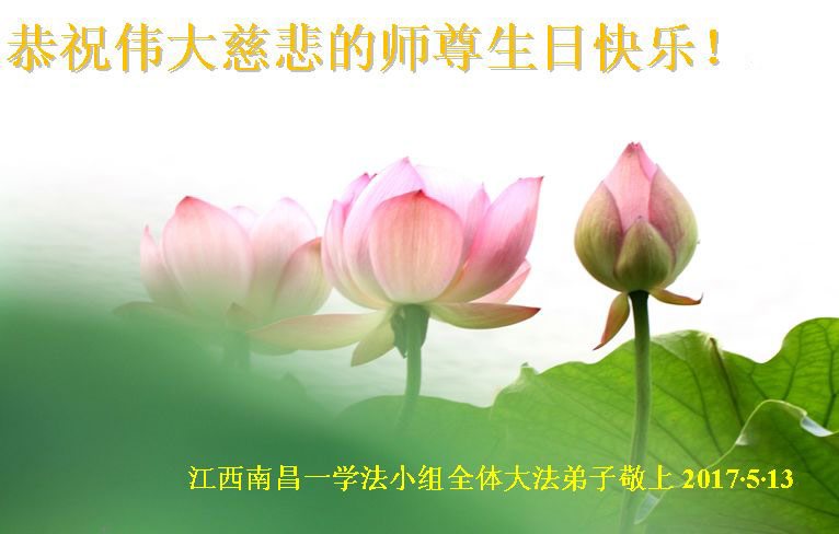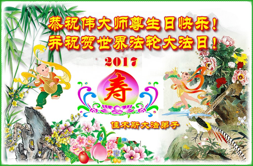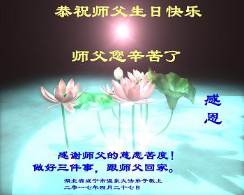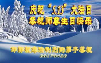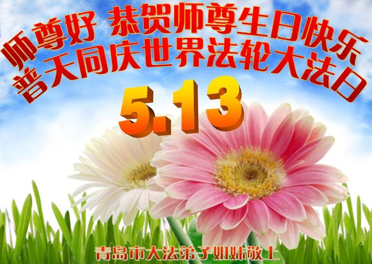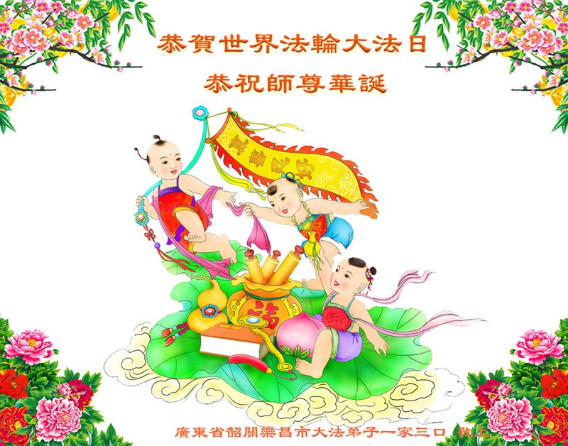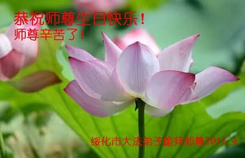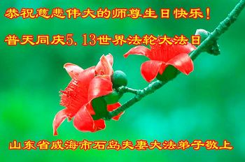 在五一三这个普天同庆队伟大时刻,我和我的家人在此恭祝:恭祝慈悲伟大的师尊生日快乐!为了芸芸众生得救,师父,您辛苦了!在此也祝贺:法轮大法洪传二十五周年!