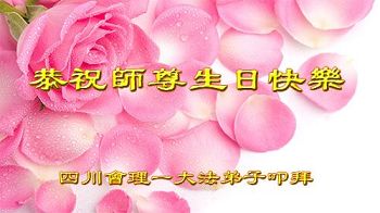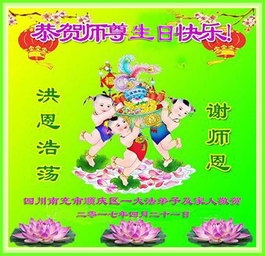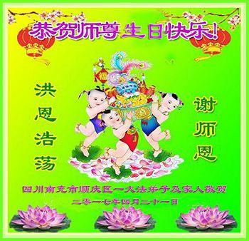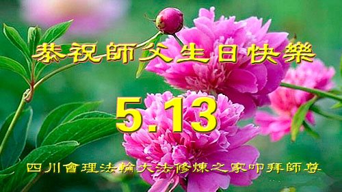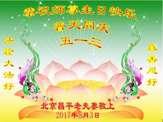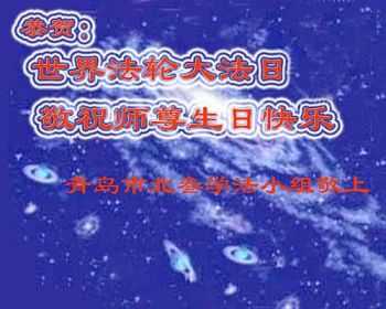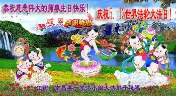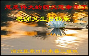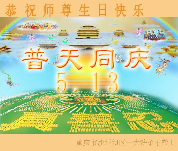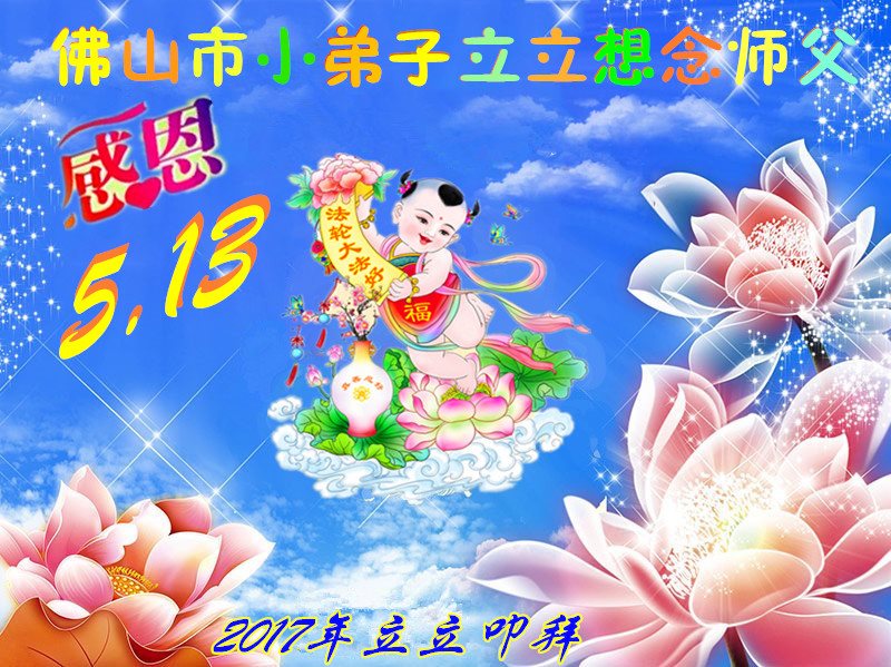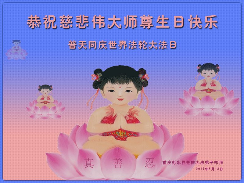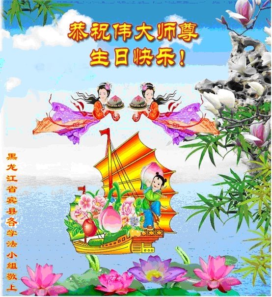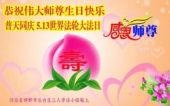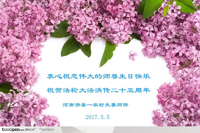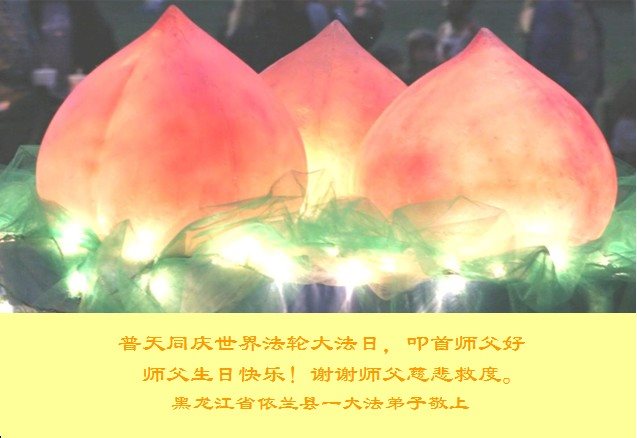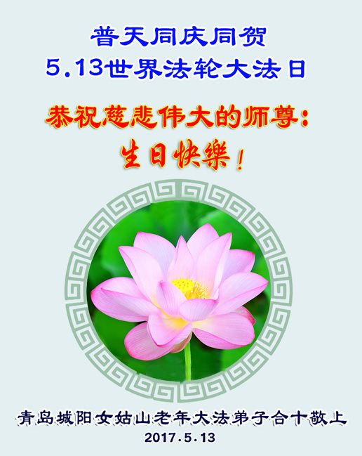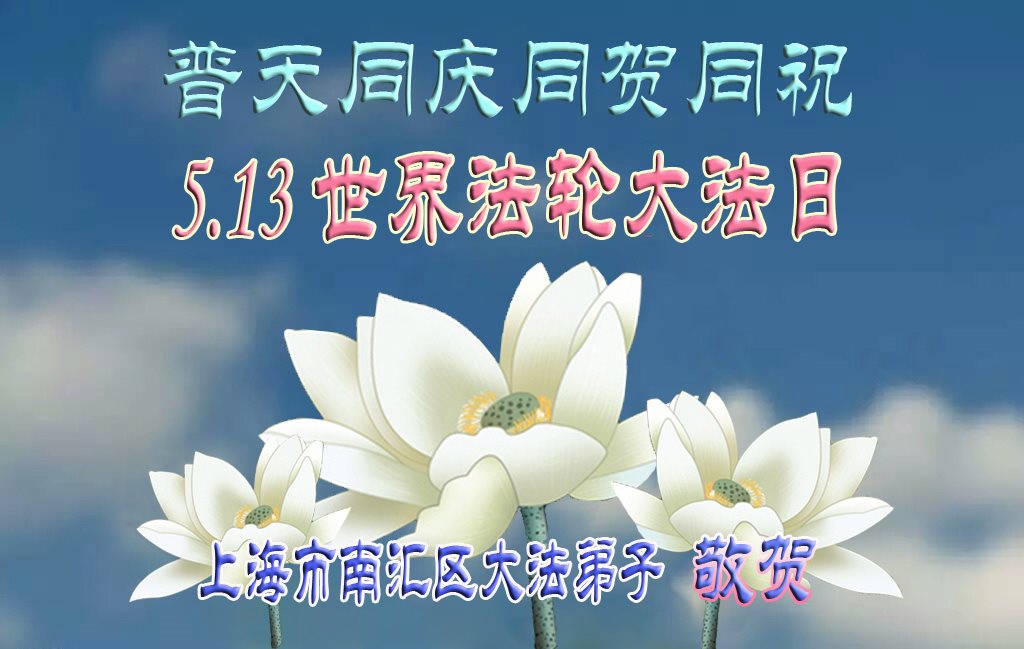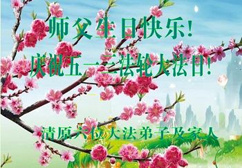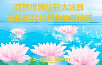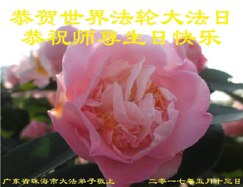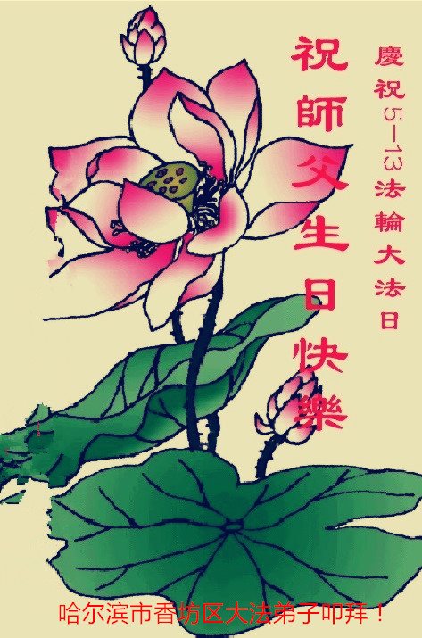 在五一三这个普天同庆队伟大时刻,我和我的家人在此恭祝:恭祝慈悲伟大的师尊生日快乐!为了芸芸众生得救,师父,您辛苦了!在此也祝贺:法轮大法洪传二十五周年!