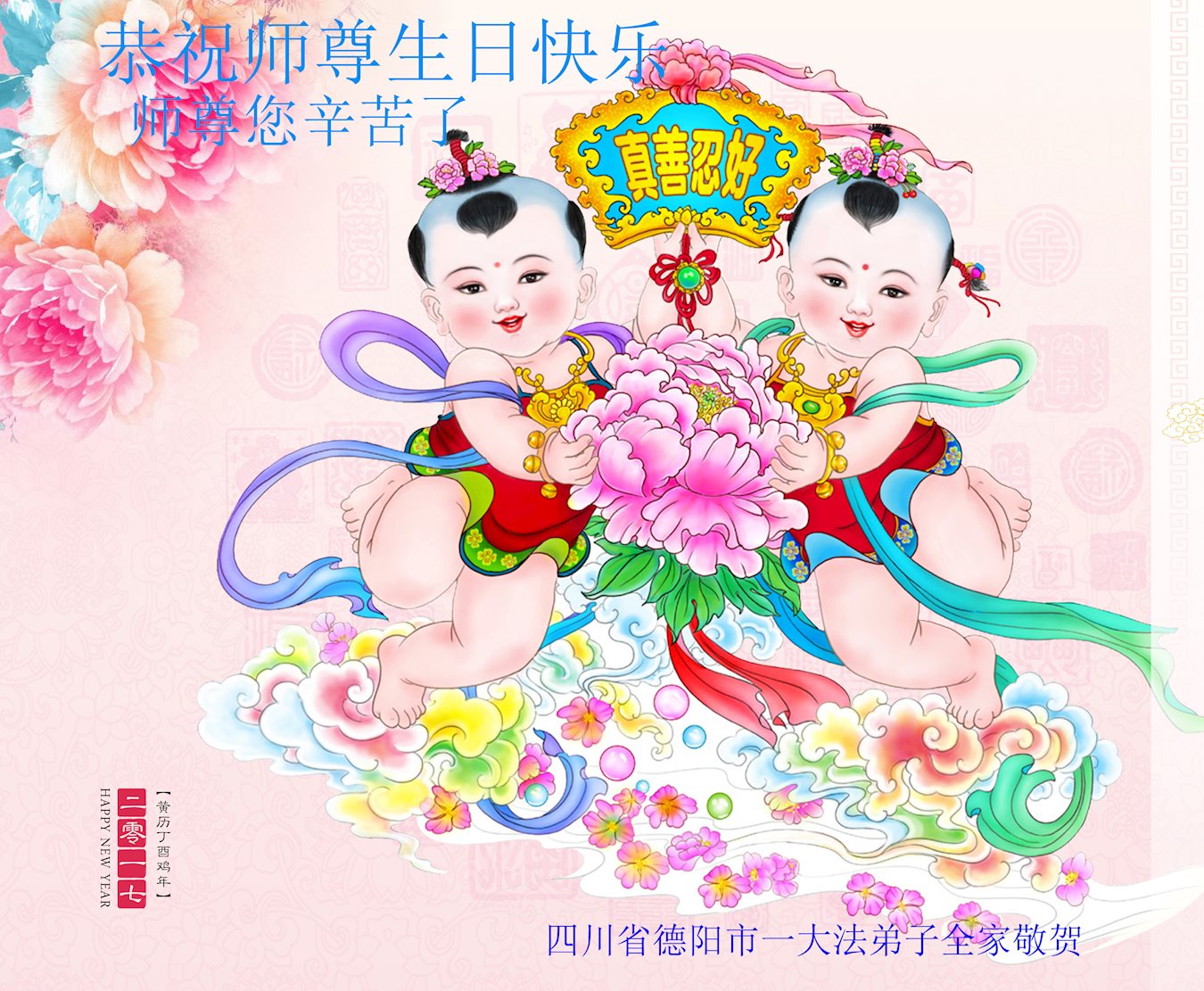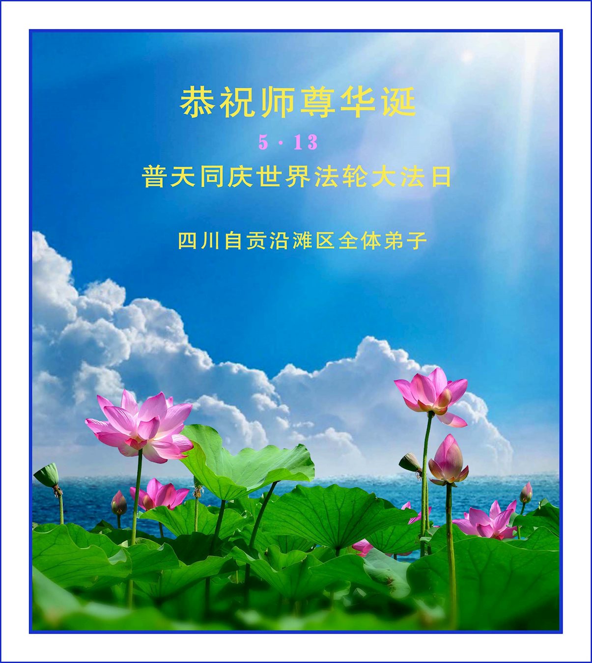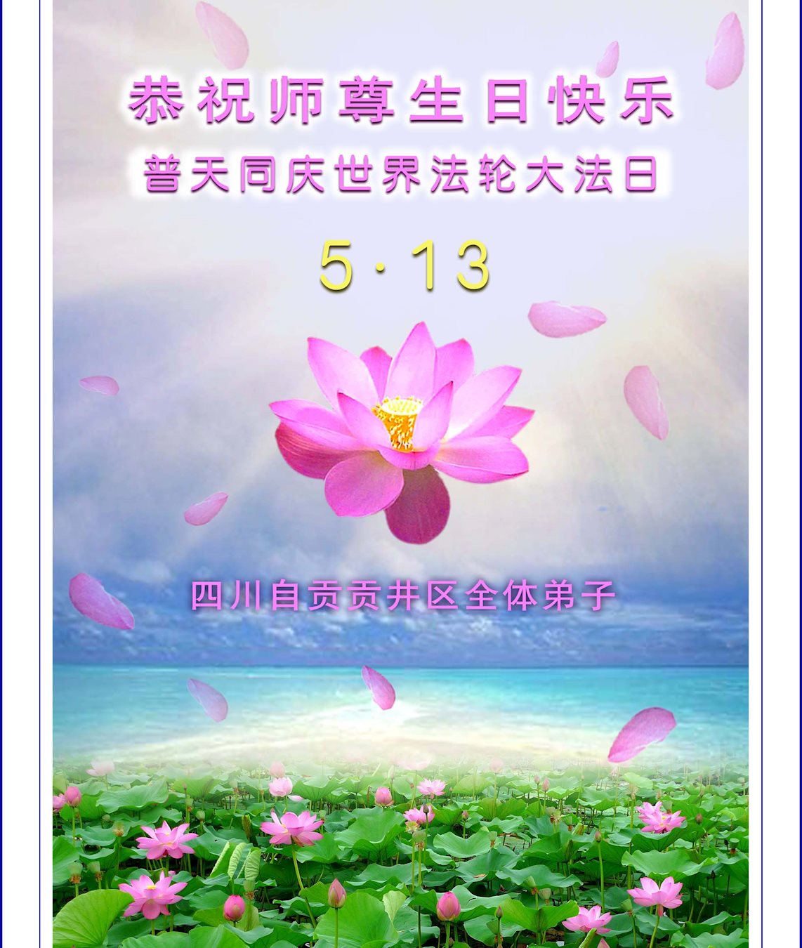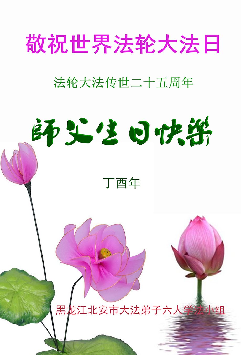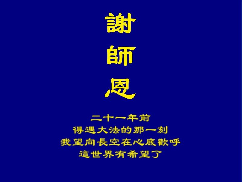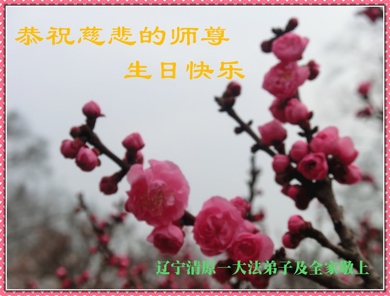 在五一三这个普天同庆队伟大时刻,我和我的家人在此恭祝:恭祝慈悲伟大的师尊生日快乐!为了芸芸众生得救,师父,您辛苦了!在此也祝贺:法轮大法洪传二十五周年!