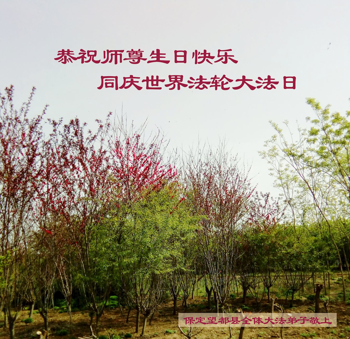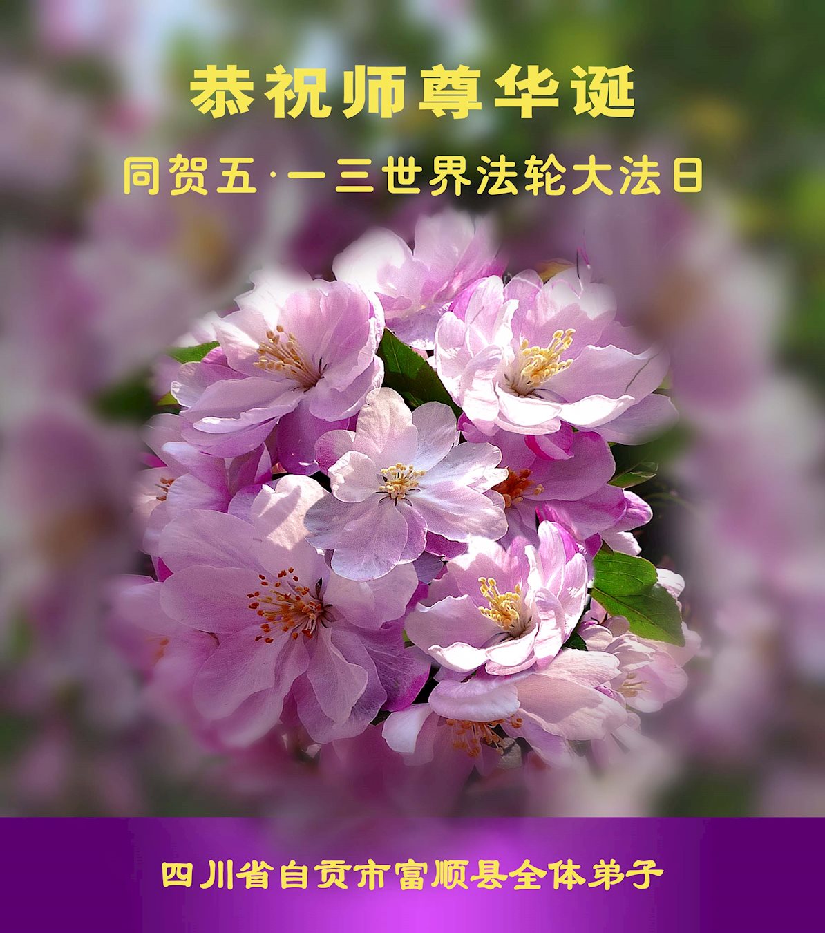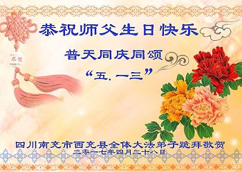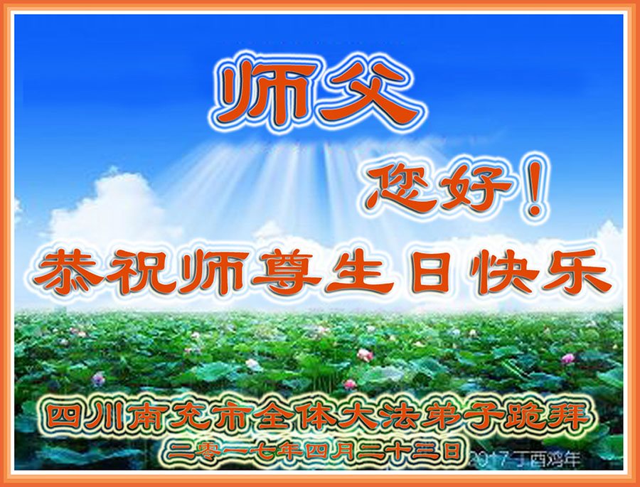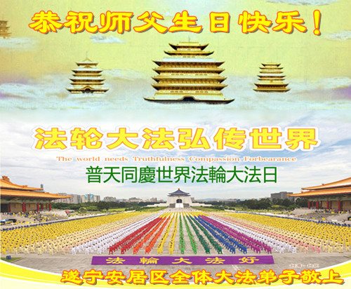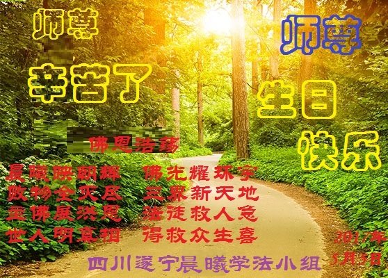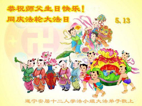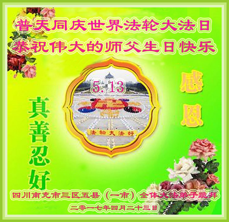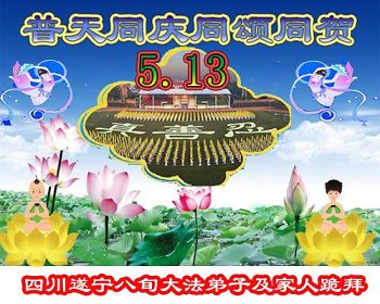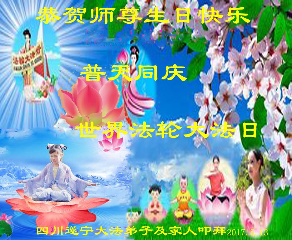 5.13是一个特别伟大的日子,是全世界大法弟子共同的节日。在此我们遂宁市乡村大法弟子恭祝师尊生日快乐! 师父辛苦了!谢谢师父的慈悲救度!在这正法的最后时间里,弟子一定珍惜师父以巨大付出所延长来的时间,圆容师父所要的,扎扎实实的做好三件事,学好法,讲真相、救众生,不辜负师父的慈悲救度,不辜负众生的期盼!惟愿师尊笑,圆满随师还。叩拜师尊!