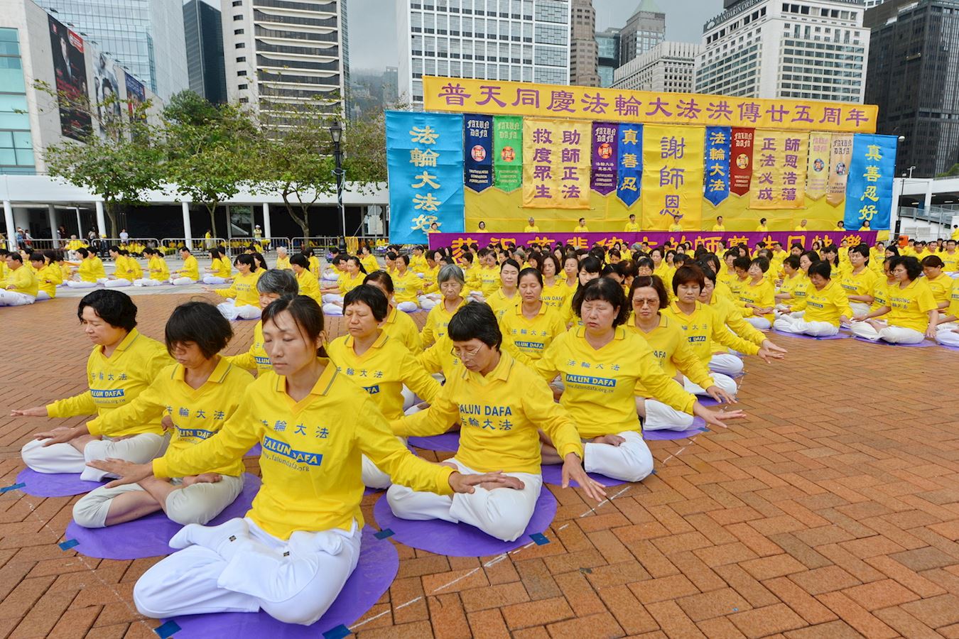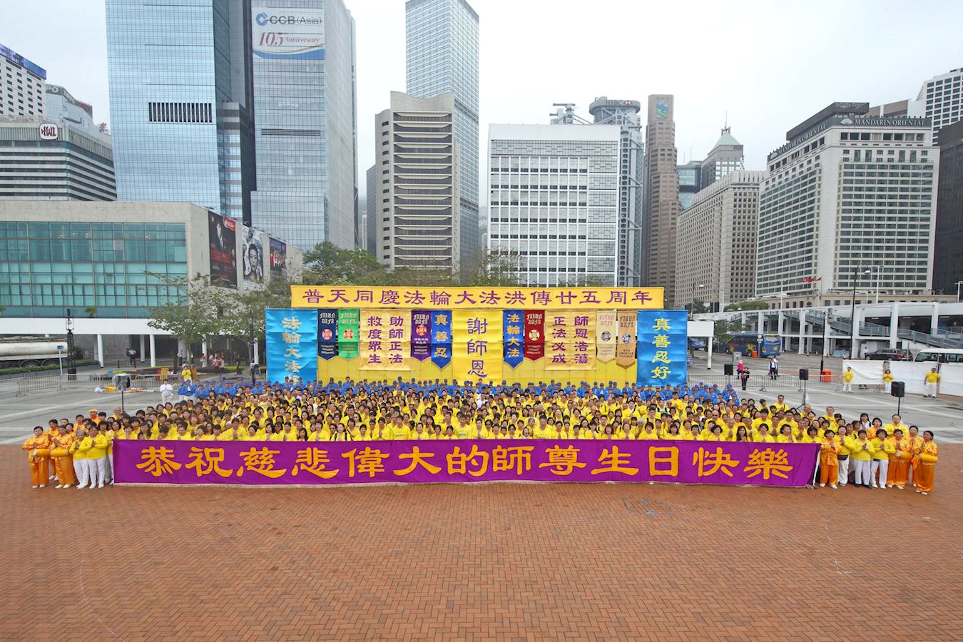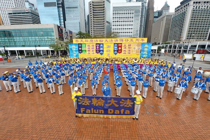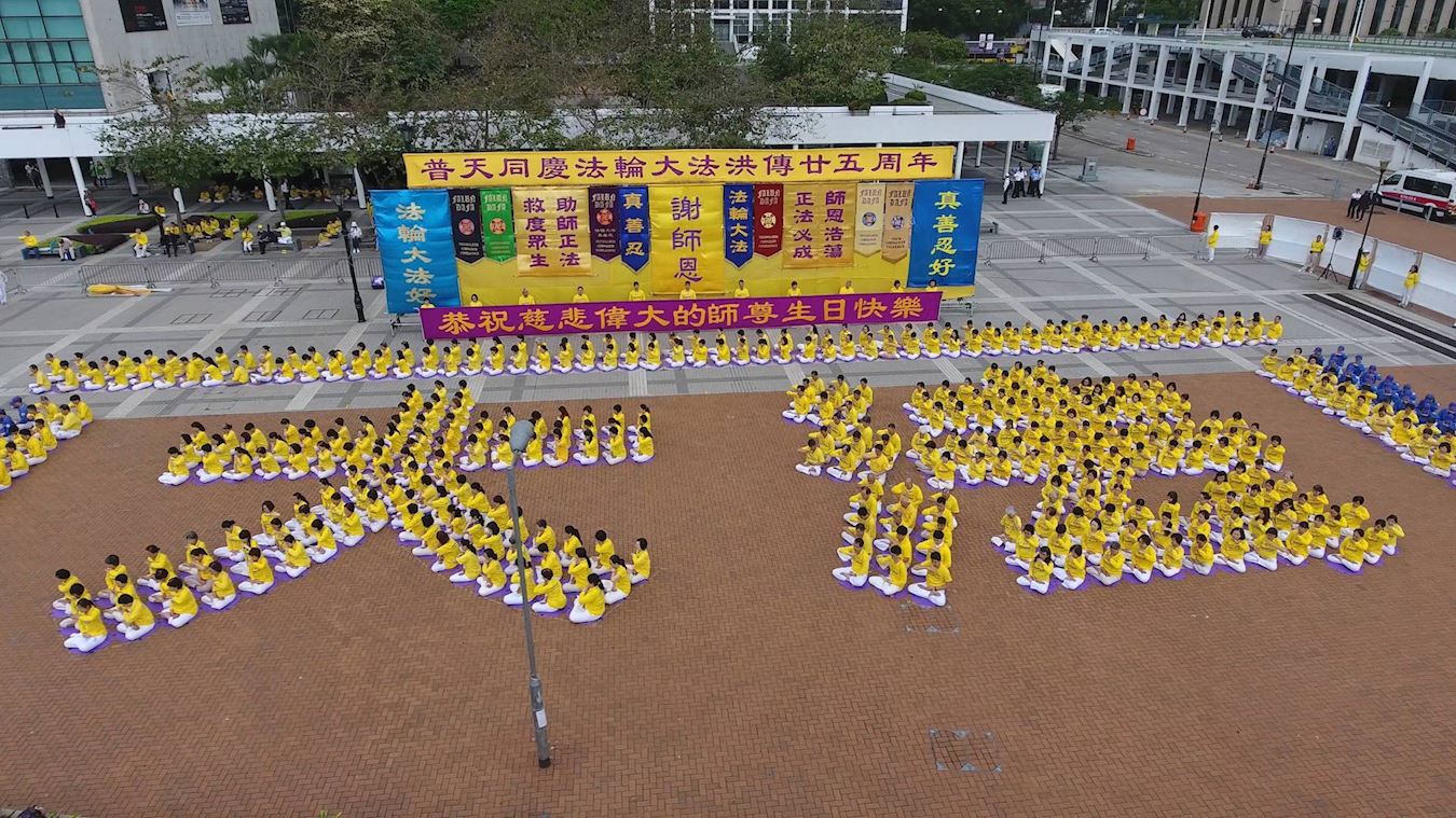 上午,法轮功学员在中环爱丁堡广场上排出“大法”二字并演炼功法,展开一天的庆祝活动。“大法”是“法轮大法”的简称,也称法轮功,是由李洪志先生于一九九二年五月传出的佛家上乘修炼大法,以宇宙最高特性真、善、忍为根本指导,按照宇宙演化原理而修炼。经亿万人的修炼实践证明,李洪志先生所传的法轮大法在把真正修炼的人带到高层次的同时,对稳定社会、提高人们的身体素质和道德水准,也起到了不可估量的正面作用。