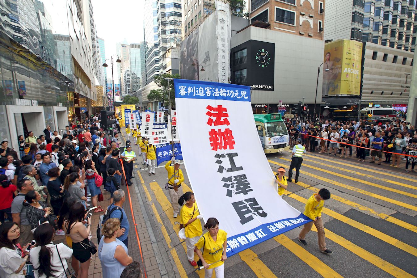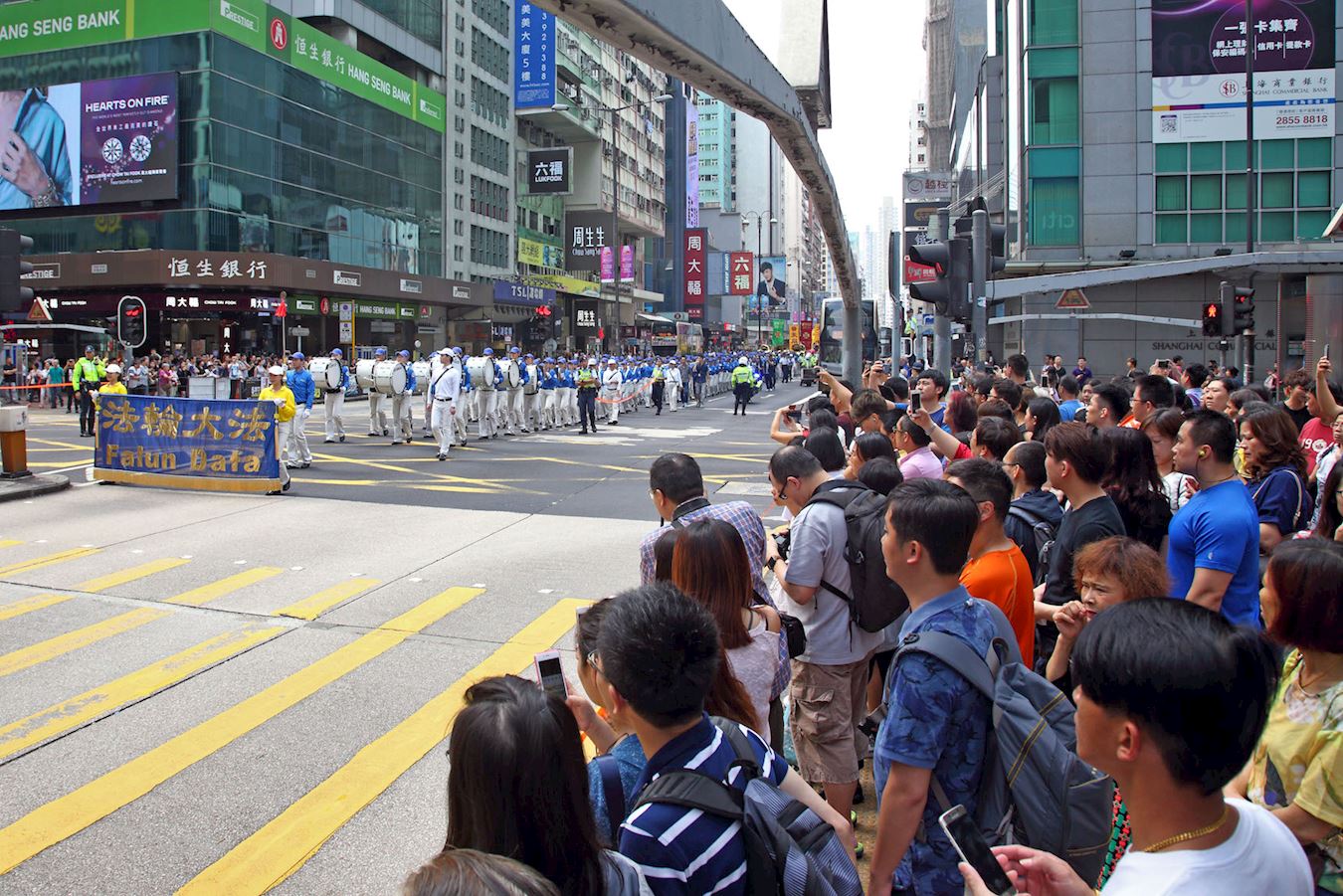 下午二时半,约七百名法轮功学员组成游行队伍,由天国乐团引领,从九龙枫树街游乐场出发,沿着长沙湾道、弥敦道、广东道前往终点尖沙咀码头。