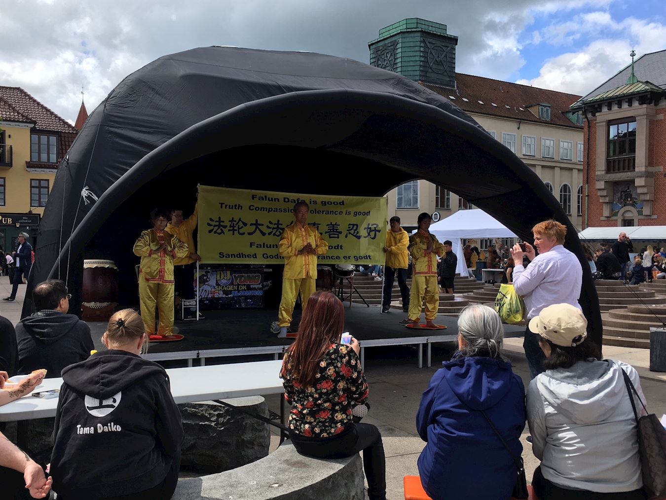 【明慧网二零一七年六月十三日】(明慧记者舒慧丹麦报道)在丹麦北部的城市奥尔堡,于二零一七年六月九日到十一日举办亚洲文化节。丹麦的部份法轮功学员参加了周六的活动。活动在美丽的海滨港口广场上举行,海风拂面,一改上周的阴雨天气。港口上停靠着一艘法国军舰,水兵们三三两两登陆观看各种文化活动。海港还有快艇表演。广场上人来人往熙熙攘攘,各种各样的展位,多个亚洲国家的风味美食,和多元文化元素。在帐篷里搭起的舞台上,来自不同亚洲国家的民众展示着自己的文化、音乐和舞蹈。