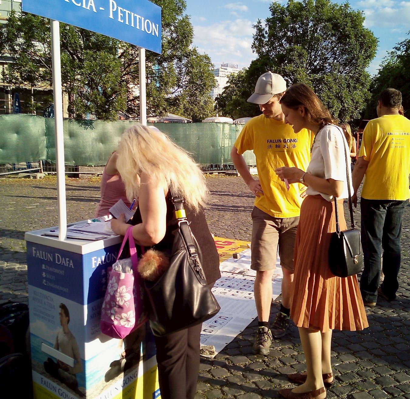 一位女士被学员们舒缓优美的炼功动作所吸引而驻足观赏,当听到学员谈到在中国大陆共产党还在迫害法轮功时,她立即去签名表示支持法轮功学员反迫害。