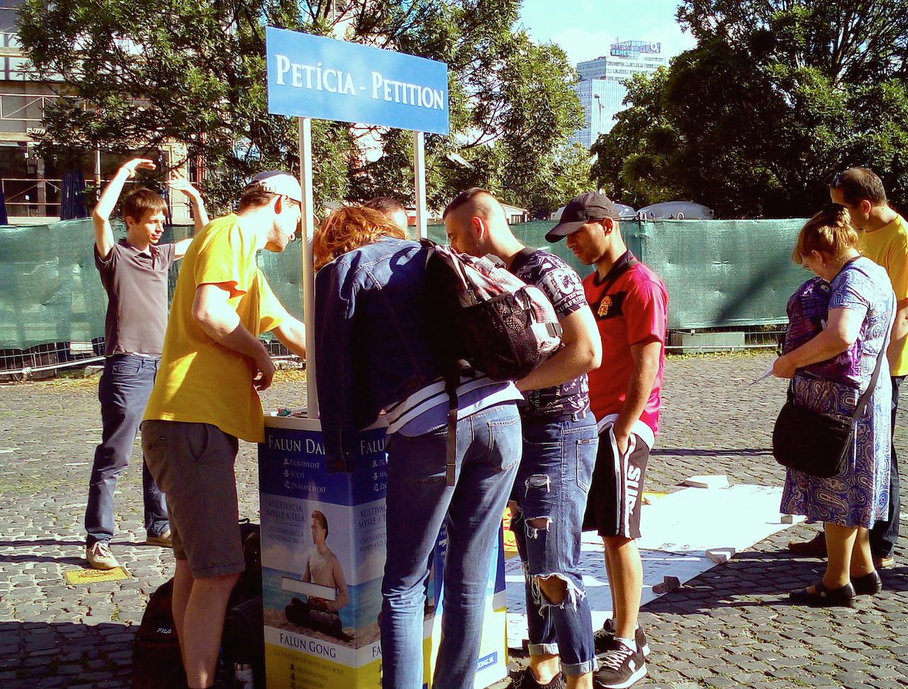 【明慧网二零一七年六月十三日】二零一七年六月十日下午,斯洛伐克首都的部份学员在市中心老城区摆开“停止迫害法轮功”横幅与法轮功真相横幅。学员们在祥和的炼功音乐中演示一至五套功法,部份学员在散发传单讲述法轮功的美好以及在中国大陆被迫害至今的真相。前来了解真相的有大学教师,有医院的大夫,有气功爱好者,有办学研究气功与哲学的著名学者,也有政府工作人员等等。