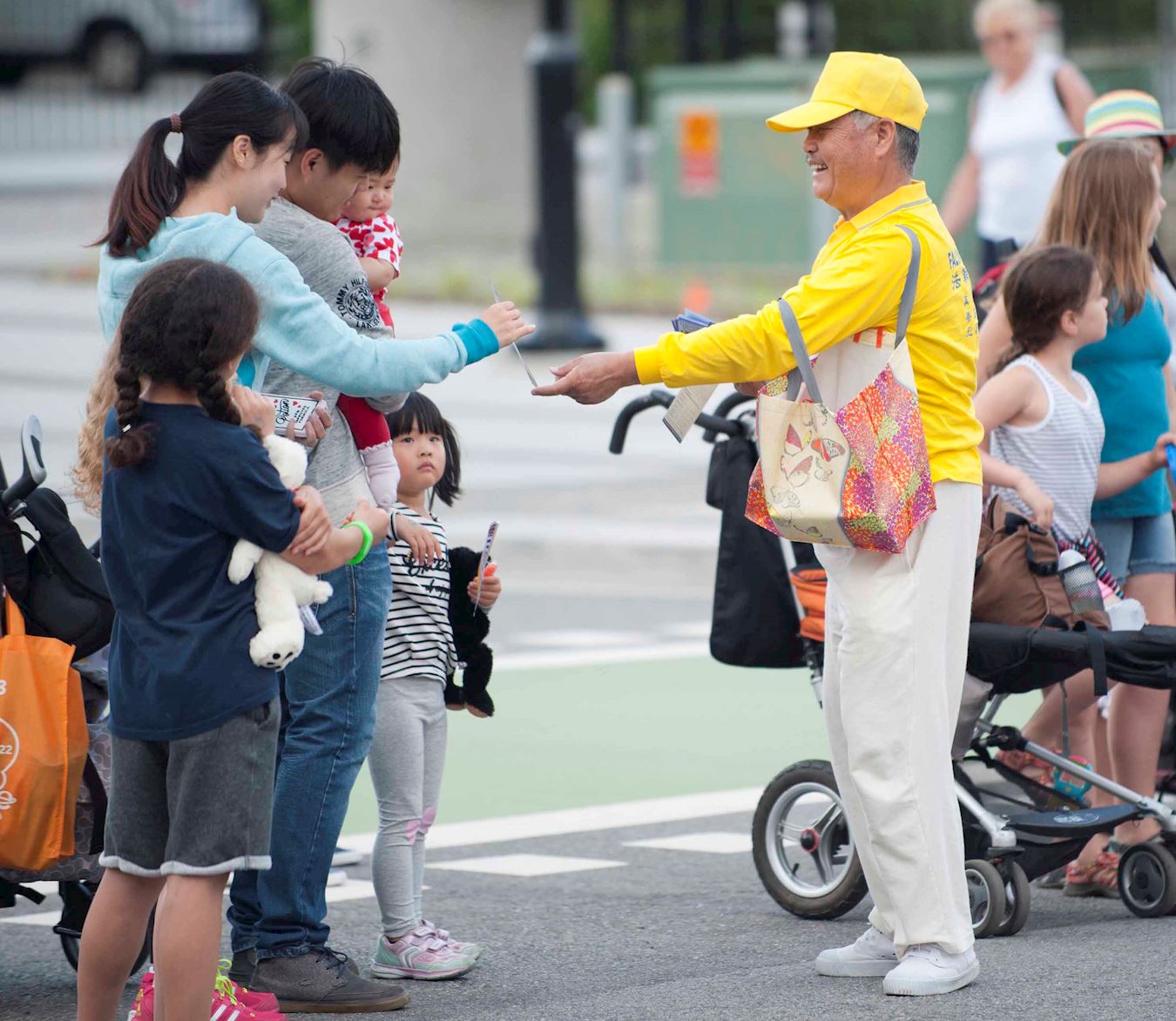 ![]() 图5:很多华裔观众纷纷接受法轮大法真相传单 |