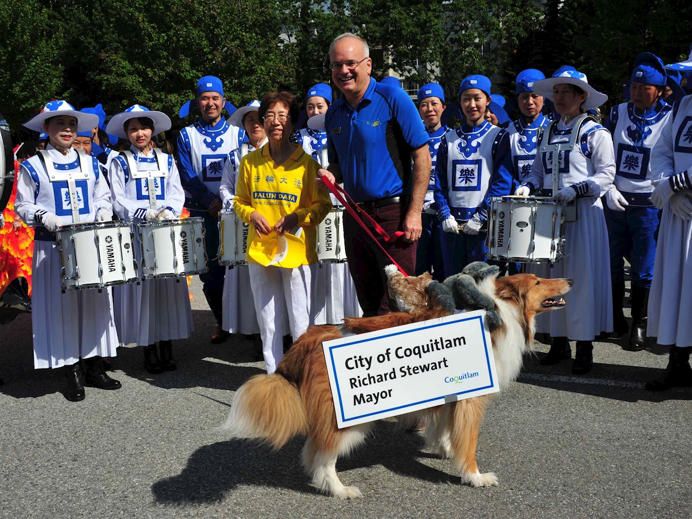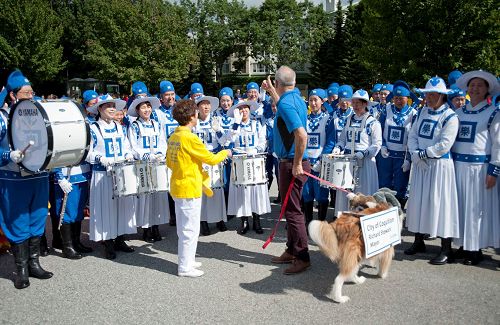 高贵林市长Richard Stewart先生当日在游行结束后特意与参加游行的腰鼓队和天国乐团合影,欢迎法轮大法来到高贵林市,并赞扬法轮功学员积极参与社区活动,给高贵林市民带来祥和美好。国会议员Fin Donnelly 先生也特意前来感谢法轮大法学员将真善忍理念带给加拿大社区。