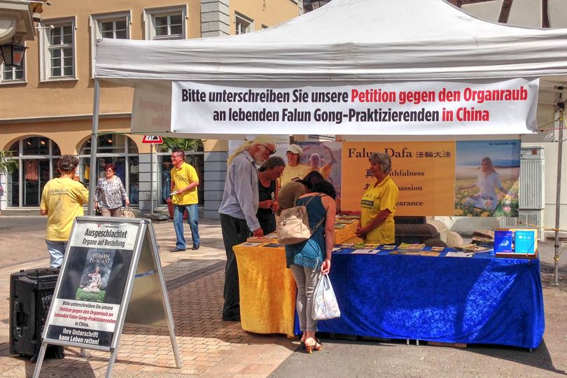酒路新城是德国白葡萄酒酿造中心之一。在六月三日的法轮功信息日上,一对年轻夫妇来到法轮功的展台和学员交谈了很久,他们听到这些迫害实例感到震惊,两个人都在“反对中共强摘器官”征签表上签名,并祝学员成功。