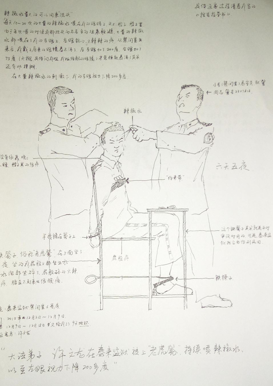 ![]() 酷刑演示图:强迫坐“老虎凳”,头部、脸部、脖子、眼睛被狱警喷入大量的辣椒水。 |