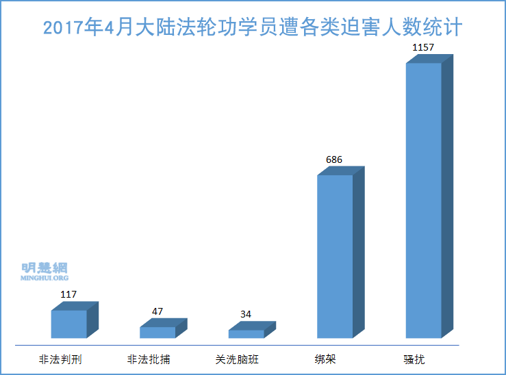 ![]() 图1:2017年4月大陆法轮功学员遭各类迫害人数统计 |