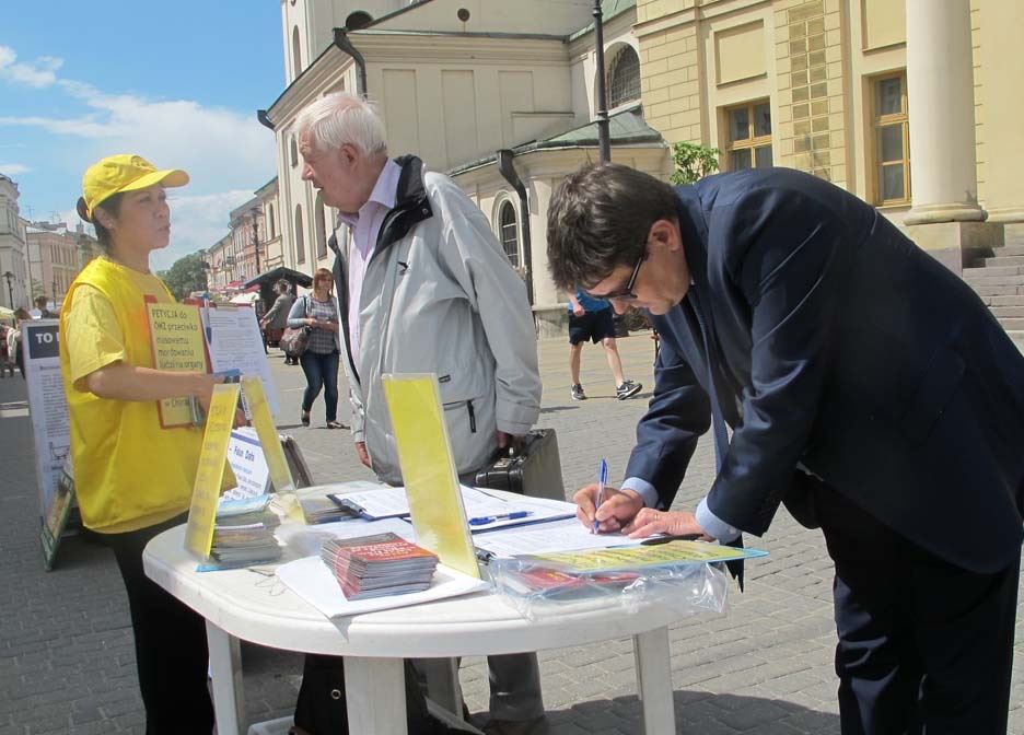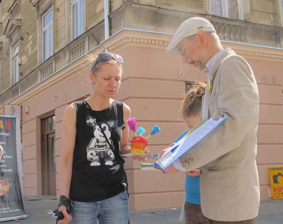 一位满头银发的男士在征签簿上签过名后,与法轮功学员交谈许久。他是一名商人,他对学员说:“我每年都参加波兹南的国际展览会,每次都能看见很多中国人,我再看见他们时,我会告诉他们法轮大法好。你们明天还在吗?我要送巧克力给你们。”他接着说:“你们做的好,非常好,这很重要啊。真的遗憾你们明天不在这里了,我也经常有机会去华沙,哪里可以再见到你们呢?”当得知法轮功学员每周六或周日会在华沙古城皇家大道哥白尼塑像旁传播法轮功的真相时,他高兴的说:“我知道那里,我会把巧克力送到那里的。”最后,他指着法轮功学员身上、印有“法轮大法 真善忍”字样的黄色体恤衫说:“这个衣服太漂亮了,我也希望能有一件。”