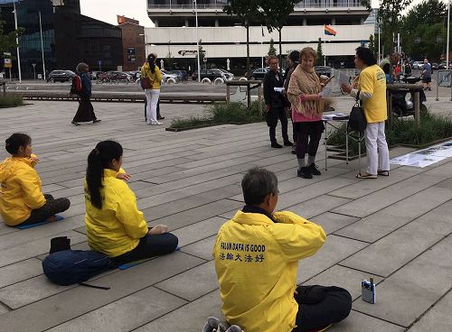 来往的人中很多人对各种文化感兴趣。Steen和他的朋友很认真的看着学员炼功,当他知道法轮功有五套功法对身体和精神都有很好的帮助,以及更多的法轮功真相。他们很感兴趣地问:“看来功法很好,在哪里有机会学习?”当他知道在上午刚刚举办了关于法轮功的讲座时,Steen觉得很可惜:“以后再办的时候能信息通知我吗?”他留下了自己的联系方式。他的朋友说,他在哥本哈根国王公园曾经看见法轮功学员在那里炼功。
