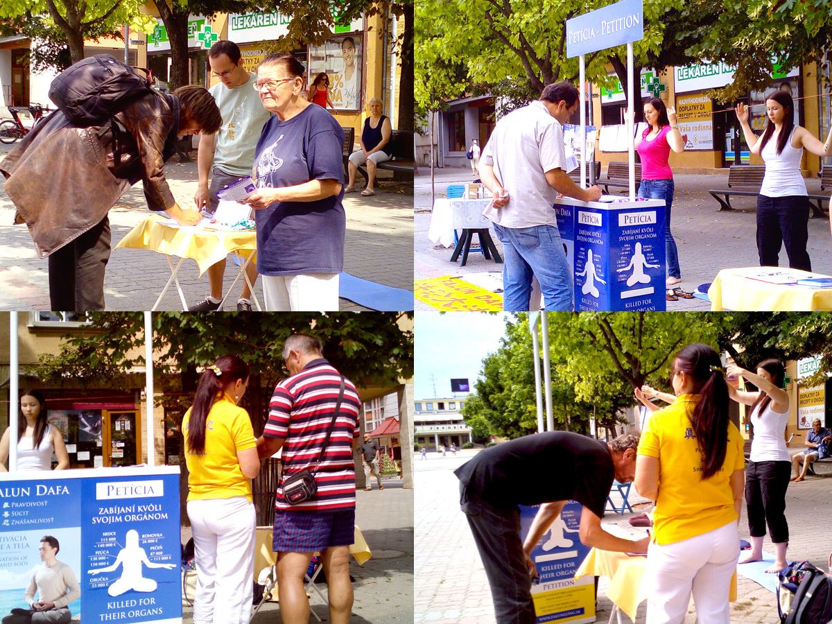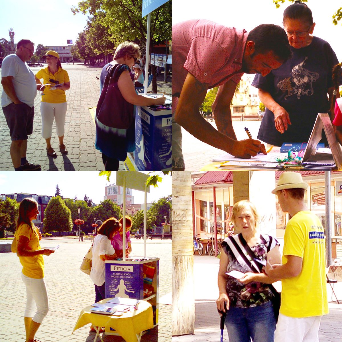 二零一七年七月七日斯洛伐克部份法轮功学员在Nové Zámky市中心广场的一角,拉开真相横幅,有的随着舒缓的炼功音乐演示一至五套功法,有的在给过往路人讲述法轮功在中国大陆被迫害的真相,有的在散发真相传单。当地的斯洛伐克人和不少匈牙利族裔的人路过时,几乎都接过学员手中的真相传单,了解法轮功真相后,纷纷来到征签台前签名表示反对迫害,反对强行活摘法轮功学员器官。