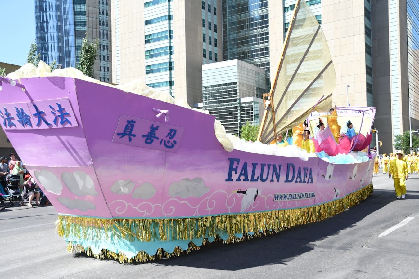 ![]() 图2:法轮功学员的大法船花车参加牛仔节开幕游行 |