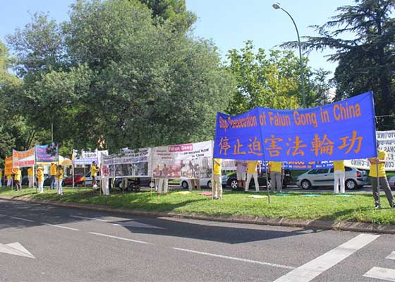 七月十五日,西班牙法轮功学员来到中使馆前和平抗议,向行人散发真相传单,讲述法轮大法的美好以及迫害的残酷。过往车辆纷纷鸣笛表示支持。