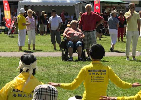 法轮功学员也在庆祝瑞典王储生日活动中搭起了帐篷,为瑞典民众介绍法轮大法,并现场展示功法,义务教功,受到当地民众的欢迎。