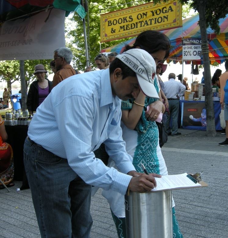 Dholakiya先生在制止中共活摘法轮功学员器官的征签表上签了名离开后,不一会儿又走回来,向法轮功学员详细问了怎么学炼法轮功及多伦多炼功点的联系方式等信息后才离去。