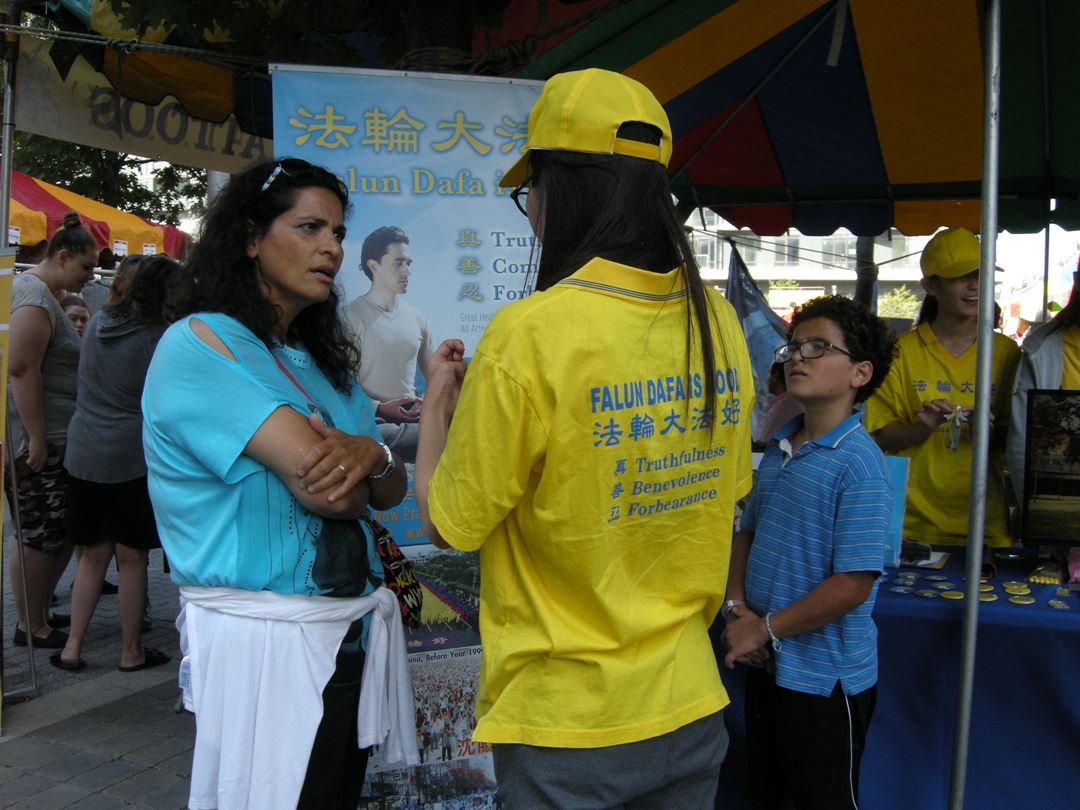 Gail女士是多伦多市的一位物业经理。她带孩子从法轮大法展位处经过时,看到法轮功学员就迎上去问:“法轮大法是什么?法轮功学员在中国为什么被中共迫害?”法轮功学员回答了她的问题。