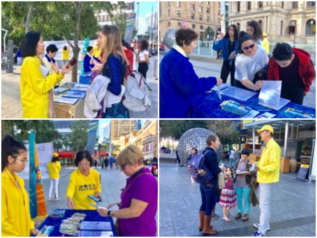 周五下午,高端名品店的集中地。一个四十多岁的女性站在门前接过法轮功学员的传单。她问法轮功学员:“你们上星期(G20峰会)在哪里?我们那时真的非常需要你们。”她说上周太糟糕了,充斥的憎恨,暴力和邪恶。她今天看到我们非常感动。法轮功学员安慰她说,“你看,我们现在就来啦,雨后就是阳光。”她哭起来,说:“我们真的很需要你们。”