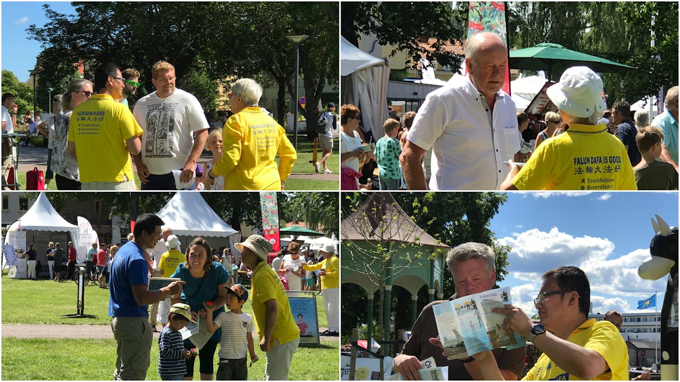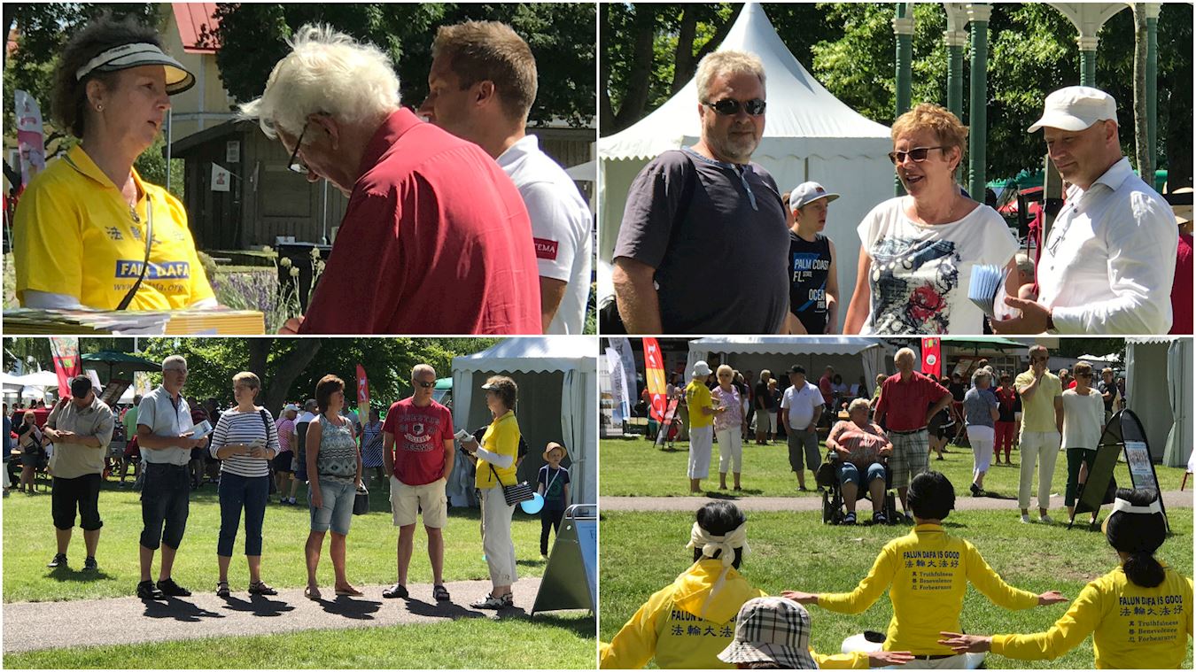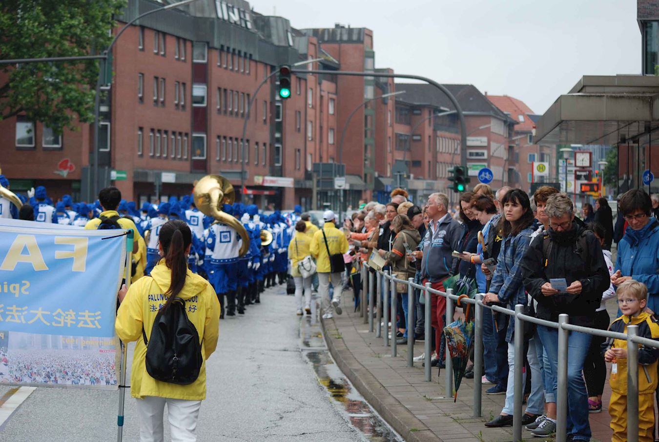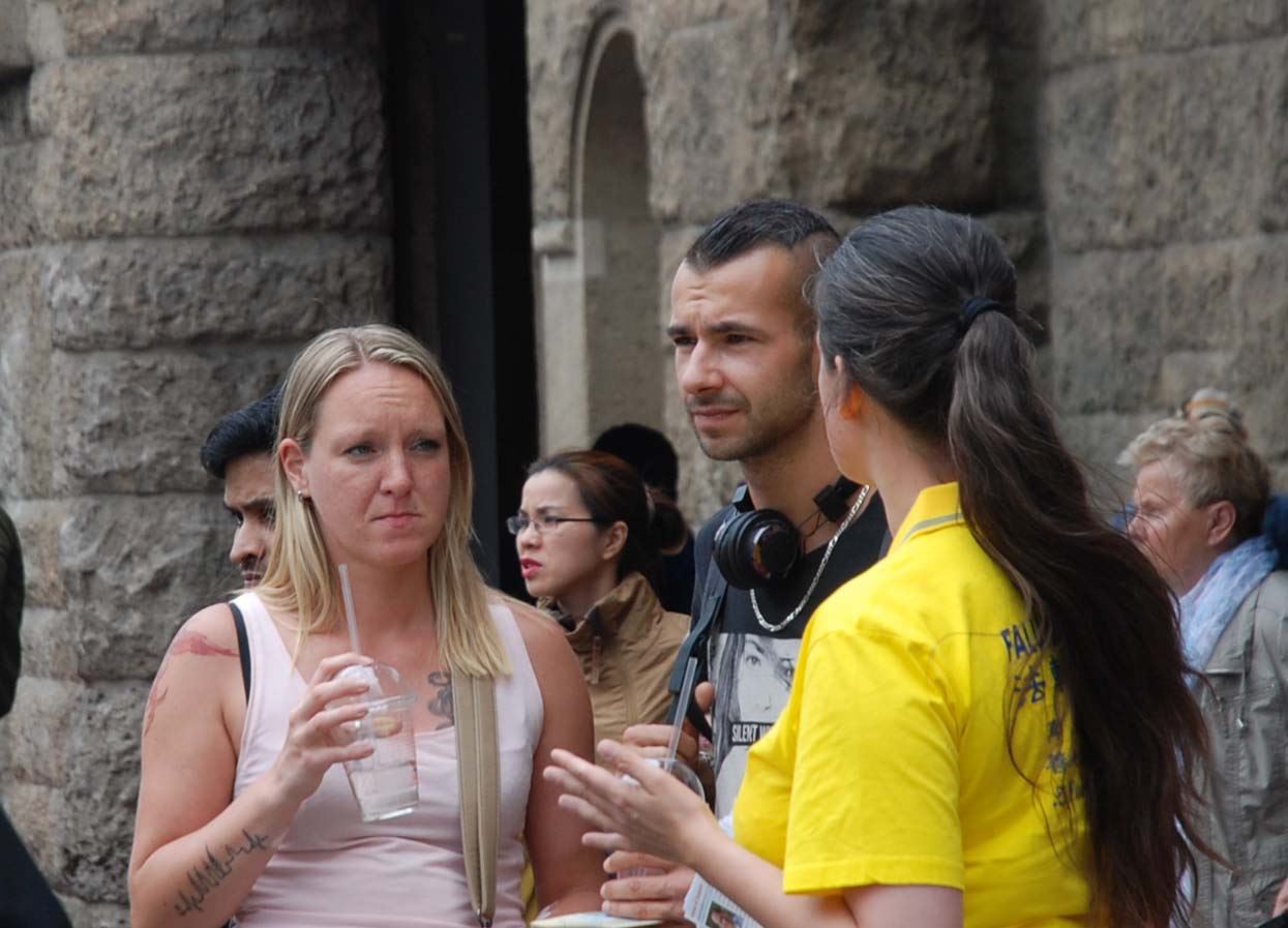 法轮大法的乐团和美丽的花车经过Alster湖边,两对五十开外的夫妇,衣着体面,气度不凡站在路边观看。他们接过学员的传单,两位女士先后问法轮功学员,说:“真善忍价值太好了,我完全支持。”“你们在哪里,上星期汉堡乱成一片,你们在哪里?”“这(法轮功学员的游行)美丽平和,为什么被迫害!?这样的(修炼功法)才是我们应该见到的,而不是暴力和动乱。”