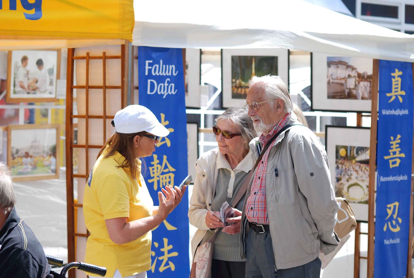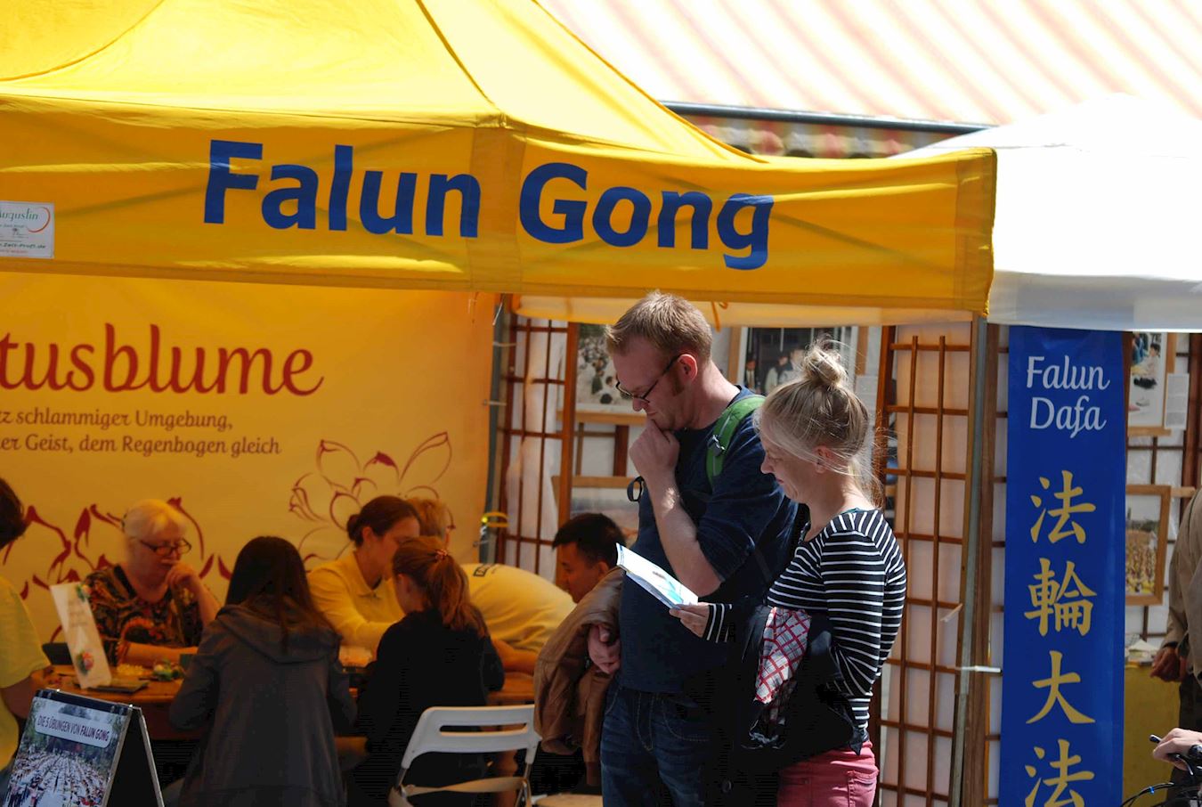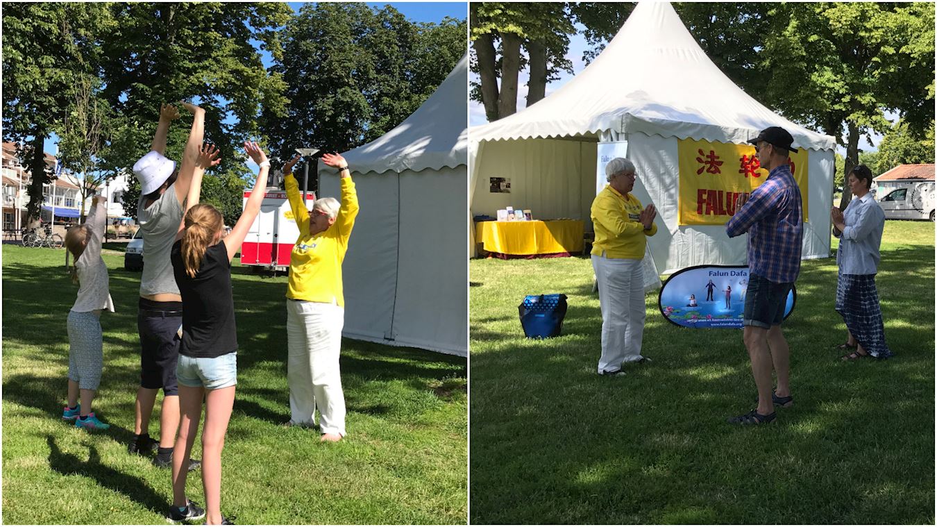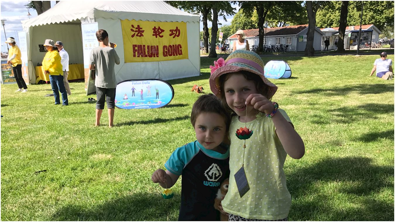 在Bergedorf的Alte Holstenstrasse路上排满各种信息展位,一眼看去望不到头。法轮功学员的真相图片展吸引市民前来了解法轮大法究竟是个什么样的功法。展位上学员搭起色彩鲜明亮丽的帐篷,教孩子们折纸莲花。边上则是四、五个学员轮流演示功法。