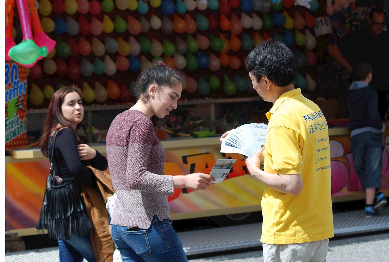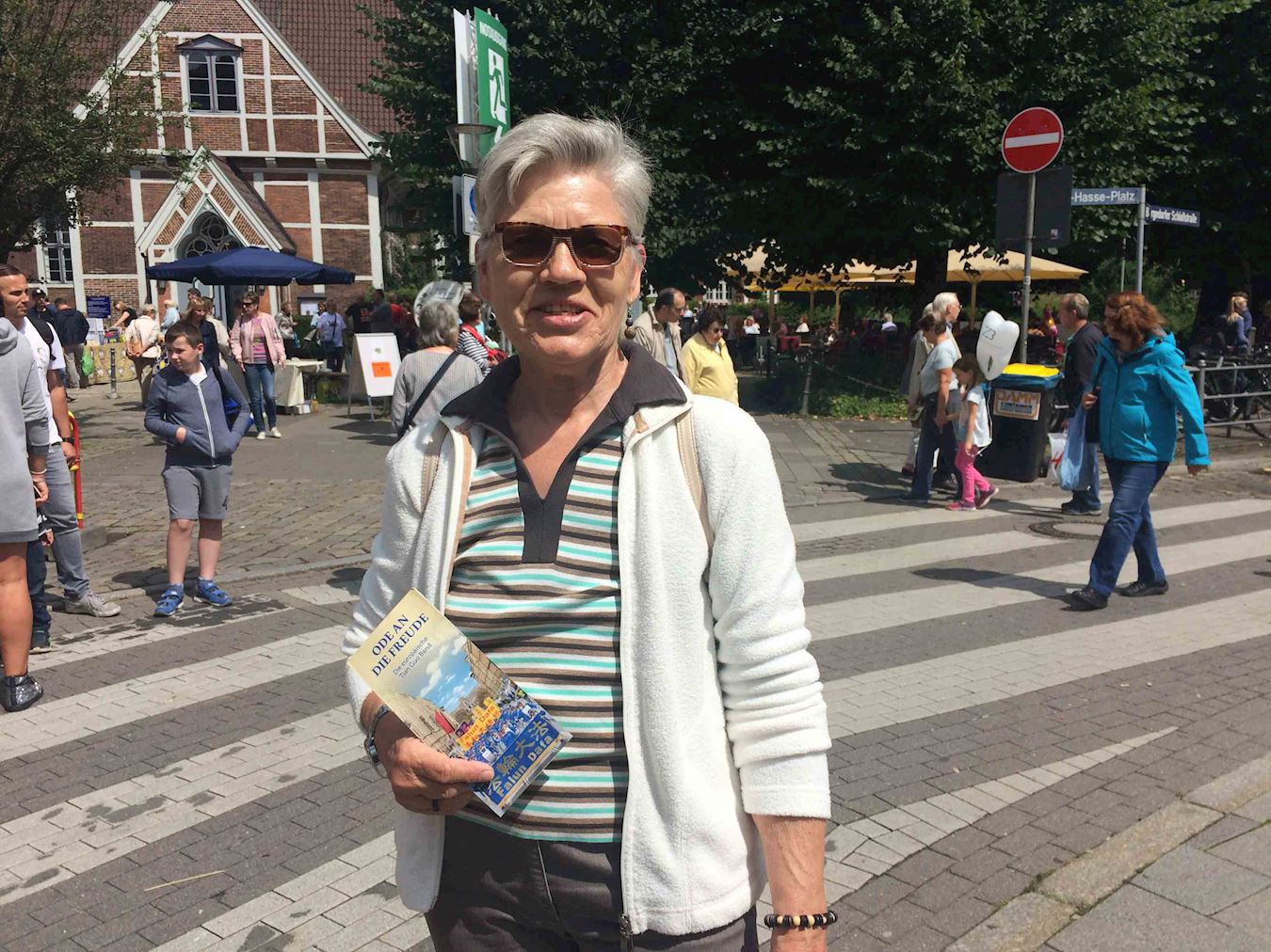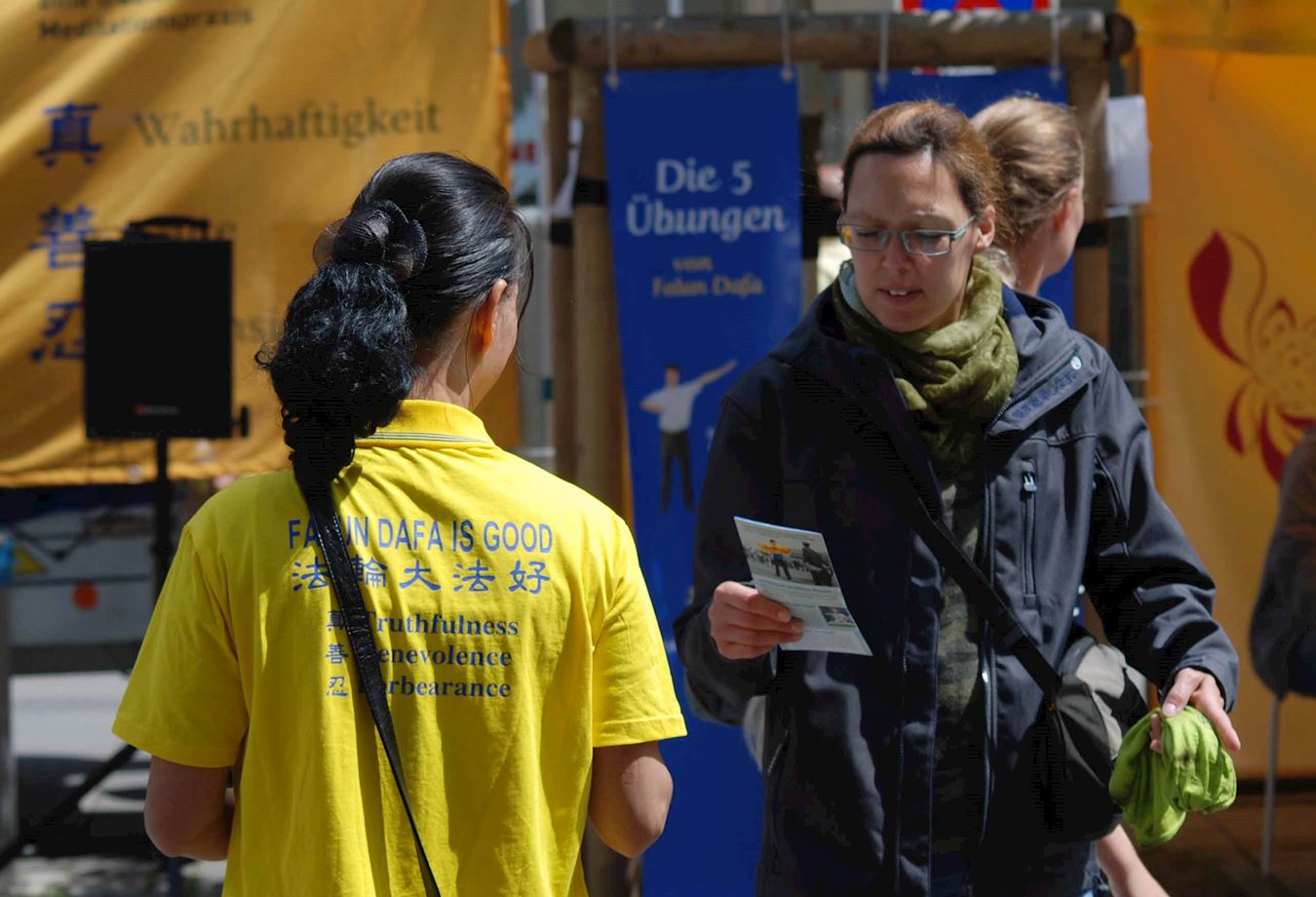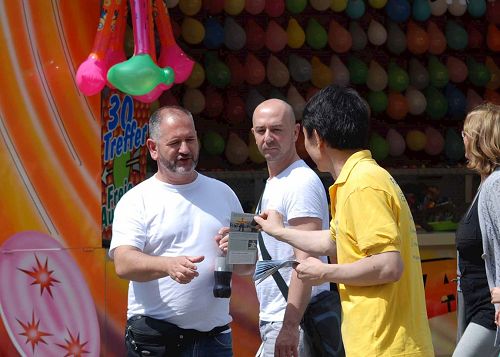 Nicole四十出头,来自Harburg,她周五的时候已经拿到了一个真相传单,可惜没有看见天国乐团。她是天主教徒,在展位上和一个女学员聊了很久,她觉得法轮大法的理念非常好,并说第二天一定要来看乐团游行。周六时她果真来到游行地点看到了天国乐团,撞见那同一个学员,她非常兴奋,说:“乐团的传统服饰太美了,乐曲令人享受并且心情愉快。我一路跟着乐团,看见很多路边的人和我一样高兴。他们还问我呢,说‘这是什么团体’,我可以告诉他们一些,因为我昨天已经看过你们的传单了。”