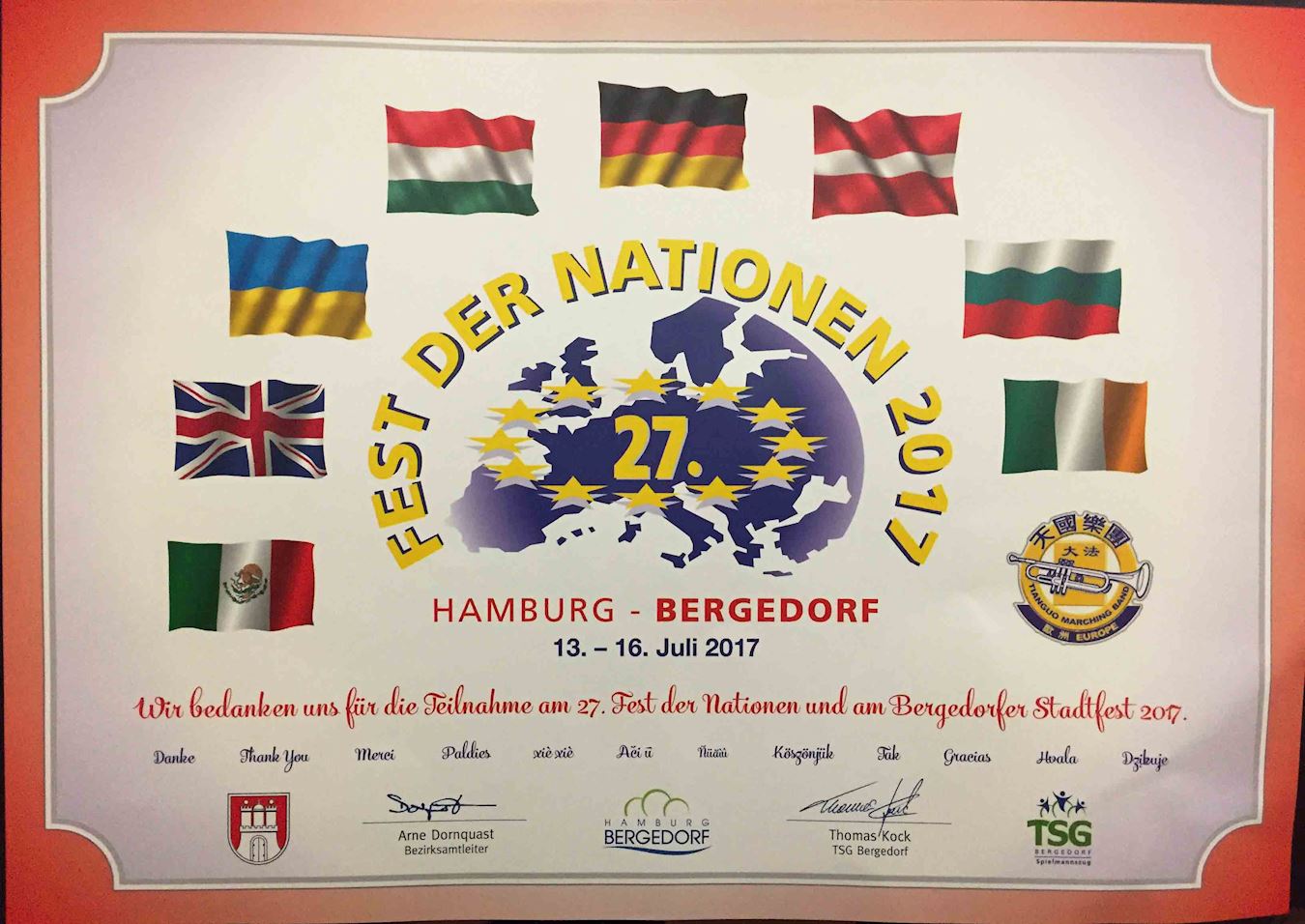 Bergedorf是汉堡东南部的一个区,在今年区政府组办的文化节活动中,五十二个来自不同国家的音乐舞蹈团体在十六日正式的游行中一显身手,向民众传播各自所代表的文化特点。天国乐团则比其他团体早行一步,在前一天就在这里开始了小型演出。