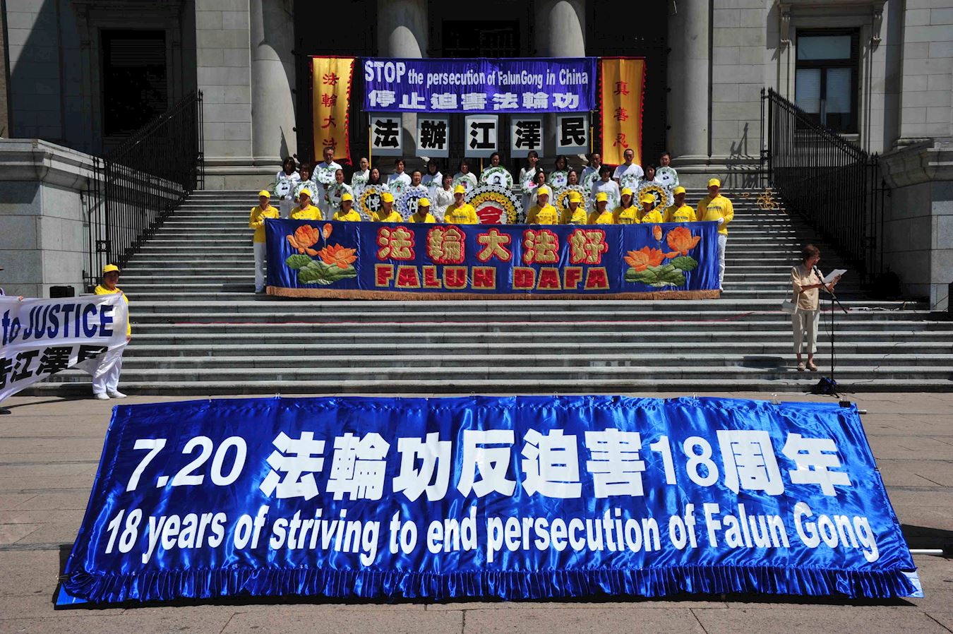 法轮大法信息中心发言人张尔平先生在集会上首先发言:法轮功修炼者是一个善良和平的民间团体,十八年前的七月二十日,中共发起对大陆上亿法轮功学员的残酷迫害,以欺世谎言蒙骗国人,把中国人推向危险的边缘。