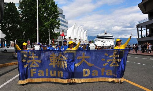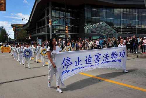 集会结束后,温哥华法轮功学员在繁华的市中心游行,沿途大量的行人纷纷拍摄温哥华法轮功学员的游行场面,很多人为游行鼓掌或向游行的温哥华法轮功学员竖起大拇指称赞。在游行队伍经过温哥华著名景点五帆酒店时,很多游客纷纷拍摄温哥华法轮功学员的游行场面,有几位大陆游客从海边跑到游行经过的路边兴奋地拍摄温哥华法轮功学员的游行场面。
