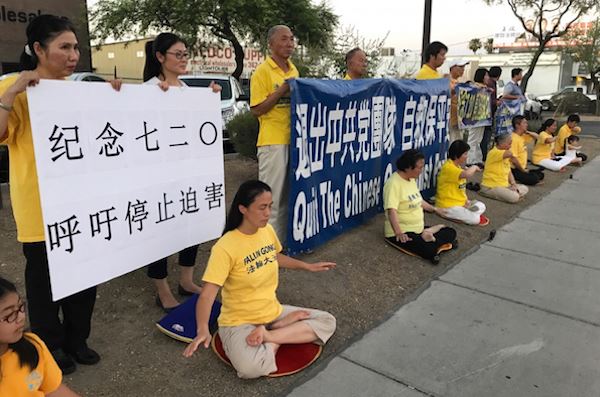 拉斯维加斯中国城位于华人集中的春山路段,法轮功学员在这里展示“纪念7.20 呼吁制止迫害”、“法轮大法好”、“退出中共党团队自救保平安”等横幅。和平悼念捍卫“真、善、忍”信仰而失去生命的法轮功学员。