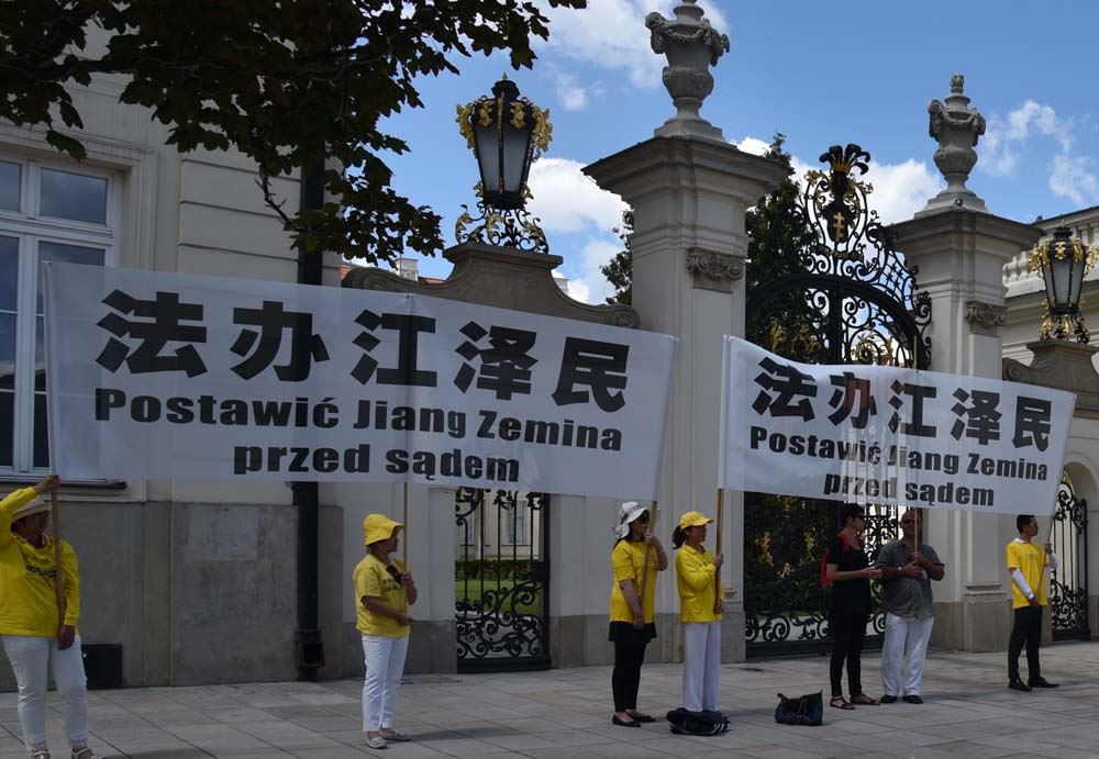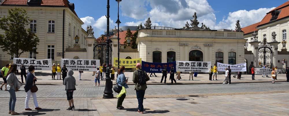 张德江到访的第二天上午,华沙风雨交加,法轮功学员一大早就在华沙议会大楼外打出条幅:“法轮大法好”、审判江泽民 还人间正道”。