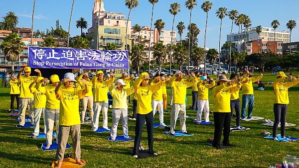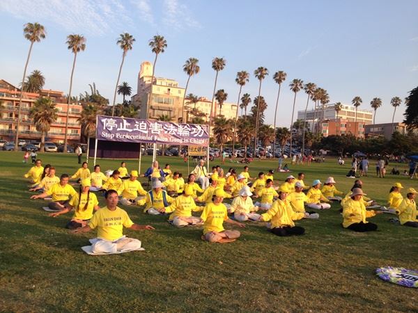 蓝天下海边宽阔的草坪上,日落前的余晖映照着法轮功学员们身上亮丽的黄T-恤,和着悠扬的炼功音乐,构成一副和美的平和宁静的炼功画面。