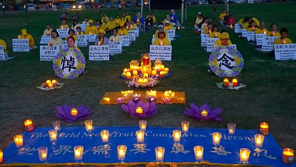 日落后,法轮功学员们点燃蜡烛,在深沉的音乐中纪念为坚持信仰被迫害致死的同修们。在他们身前的小展板上分别写着:“停止迫害法轮功”、“制止活摘器官”、“法办江泽民”等。