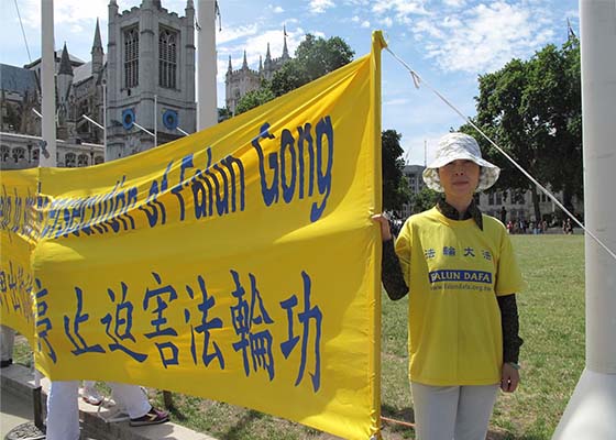 有亲友正在中国遭受中共迫害的部份英国法轮功学员们,于七月十八日,再次来到议会大厦前广场,参加讲真相反迫害活动。