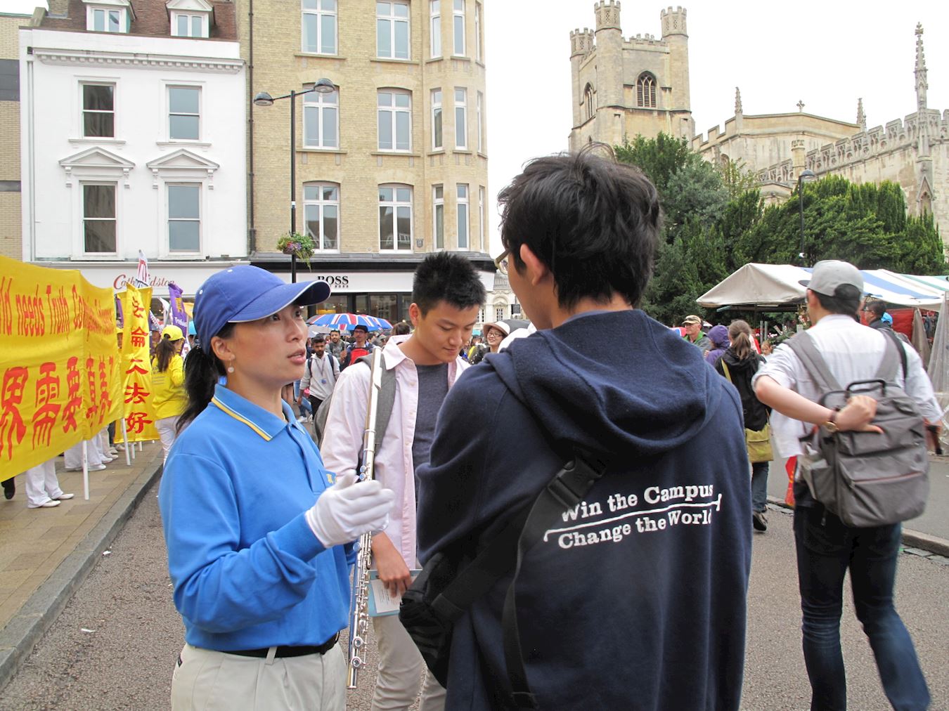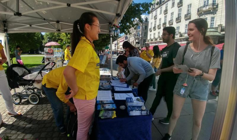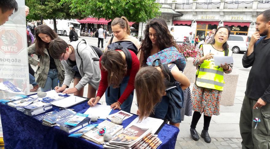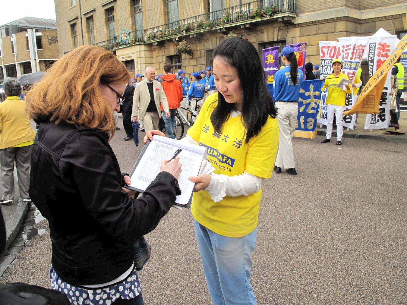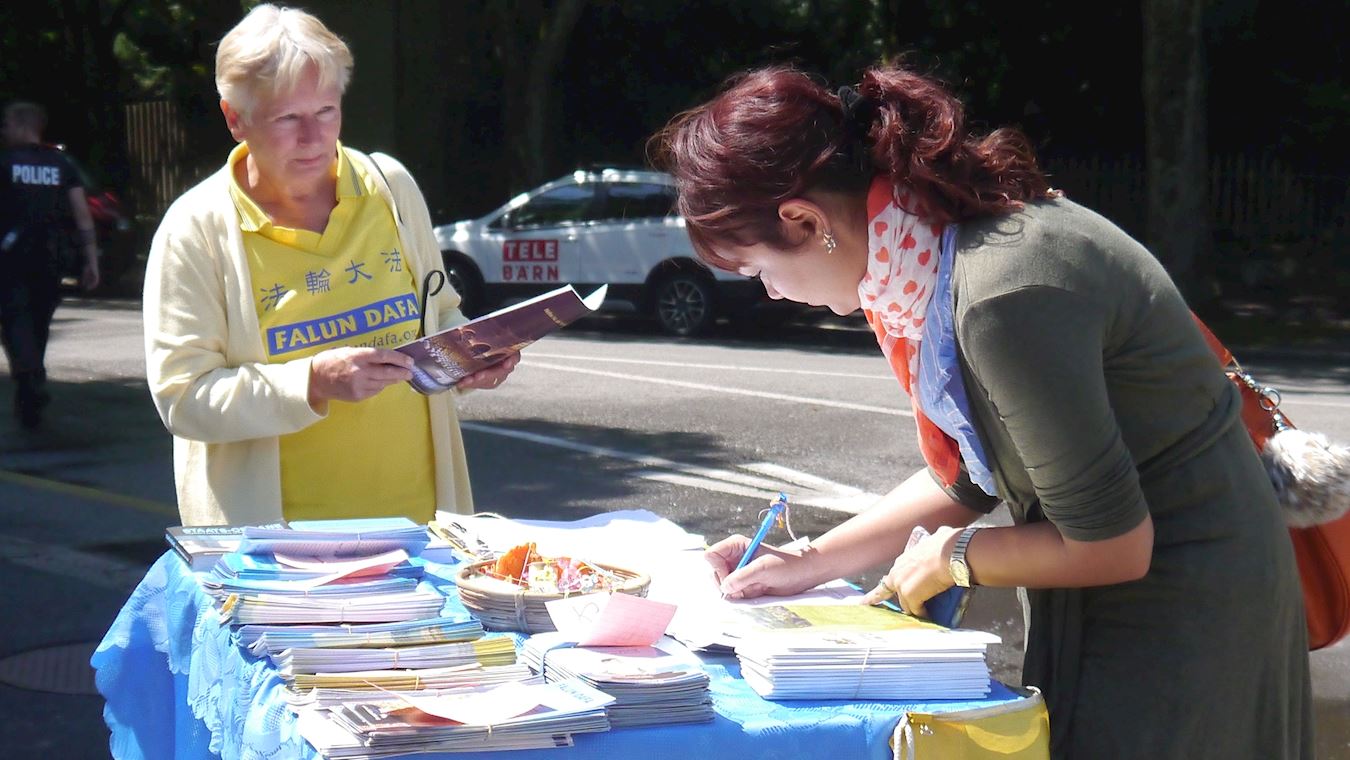 当得知在网站上可以看到法文版的书籍和教功视频时,她连声说:“太好了!”她跟炼功的法轮功学员合影照相后,又从法轮功学员那里拿了些中文真相传单,说:“我会把真相传单给我车里的中国人!”