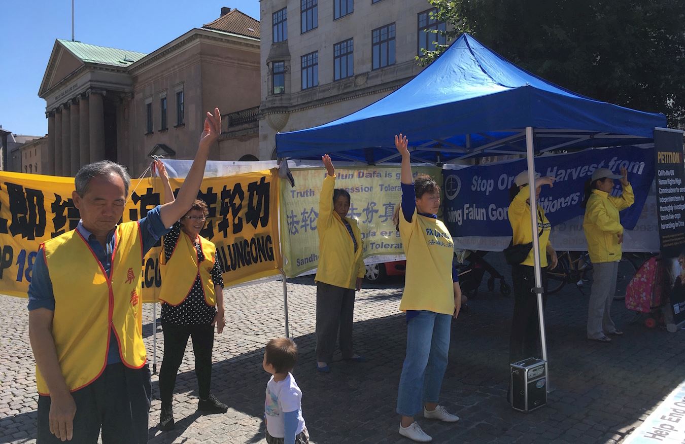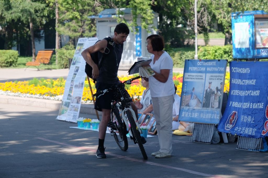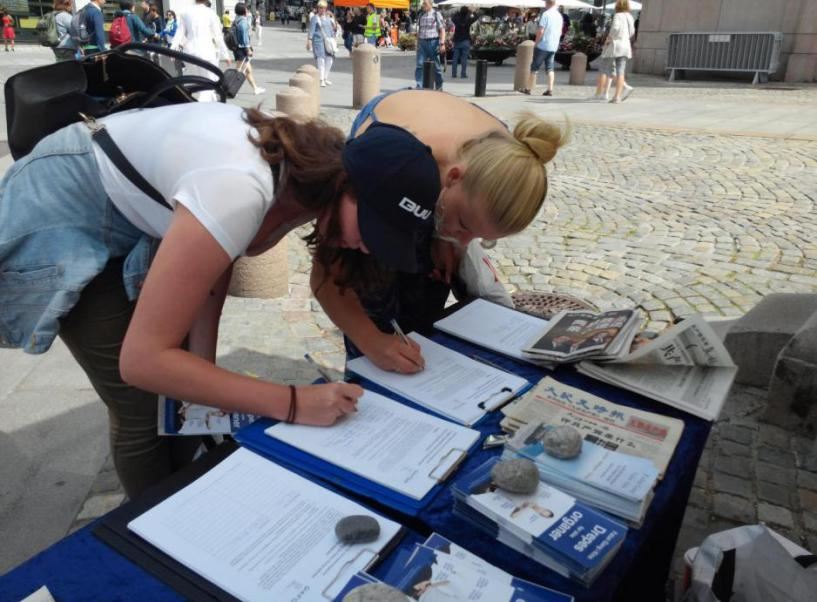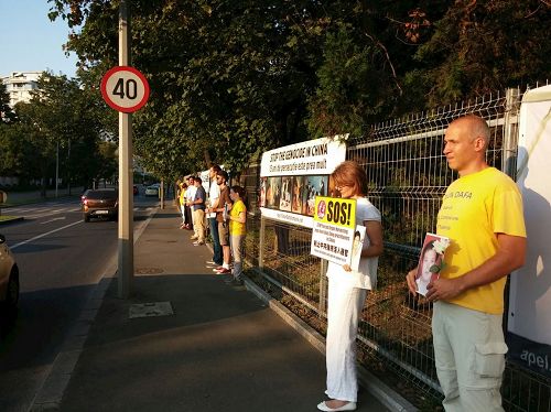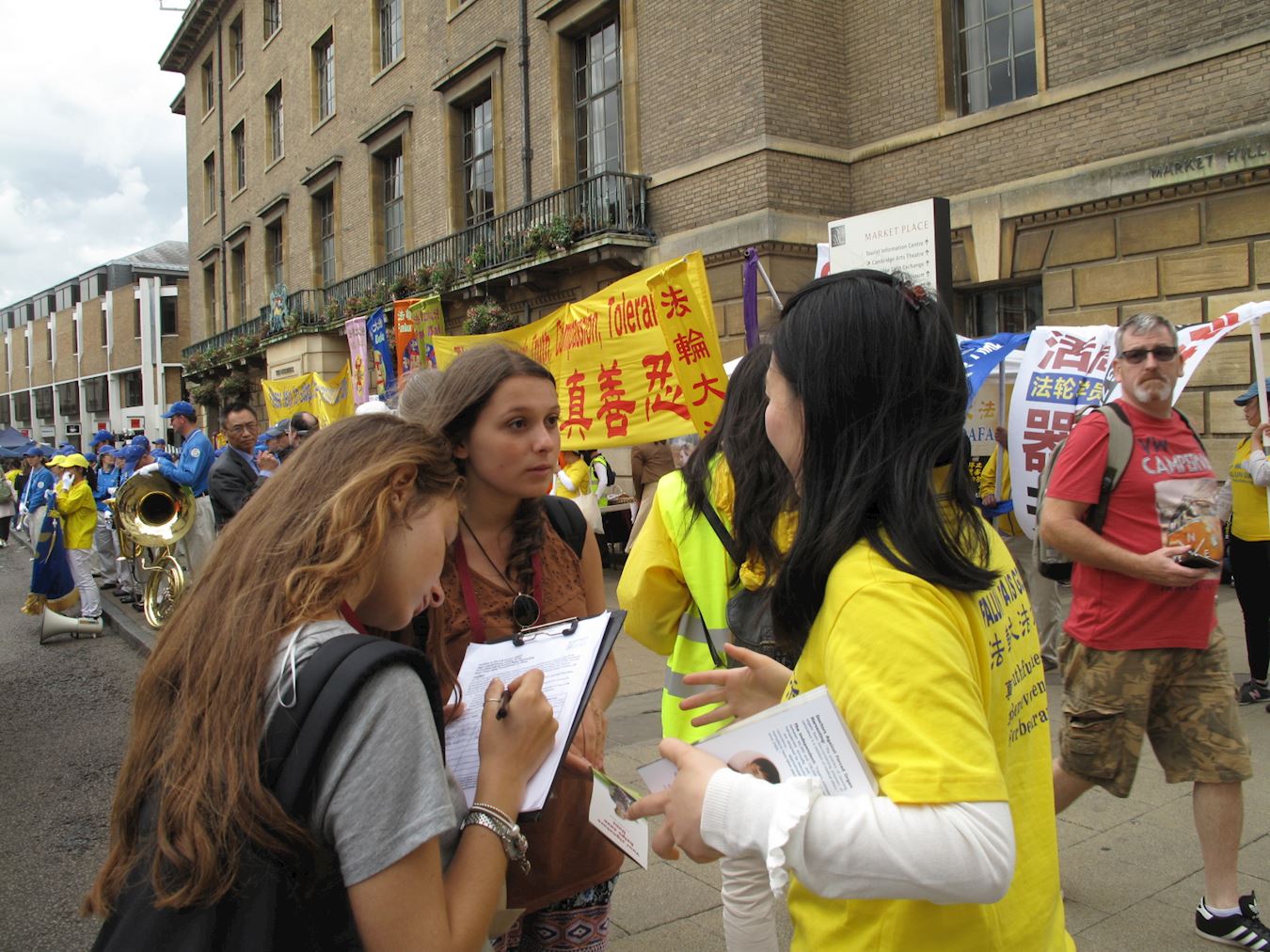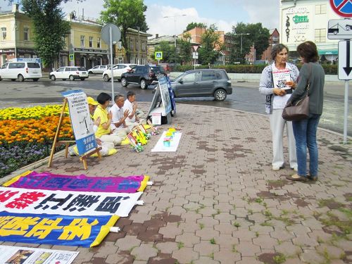 当得知在网站上可以看到法文版的书籍和教功视频时,她连声说:“太好了!”她跟炼功的法轮功学员合影照相后,又从法轮功学员那里拿了些中文真相传单,说:“我会把真相传单给我车里的中国人!”
