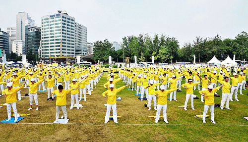 ![]() 图1~3:二零一七年七月二十日,韩国法轮功学员在首尔广场举行“七二零”反迫害十八周年集会活动。图为集会之前集体炼功场面。 |