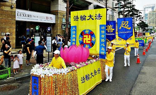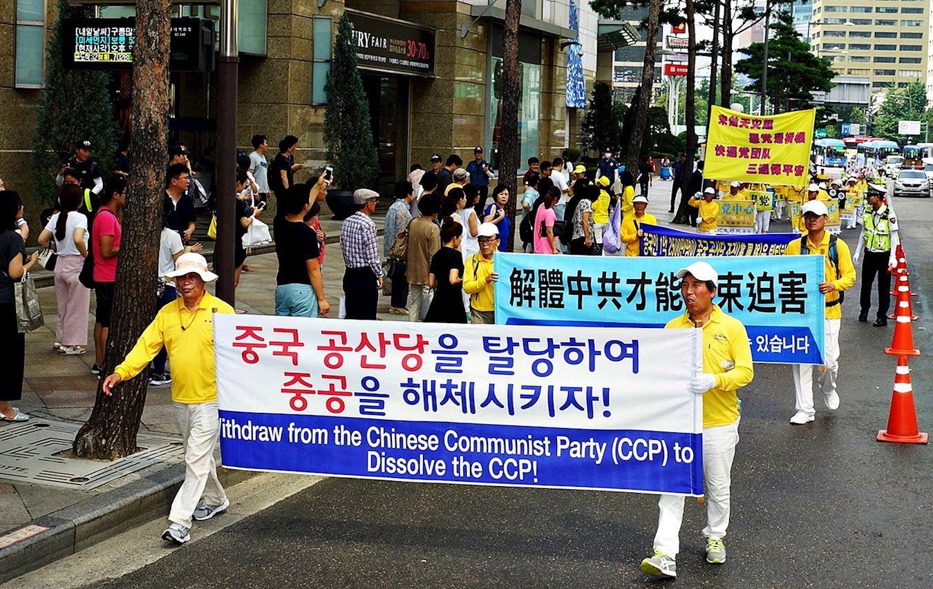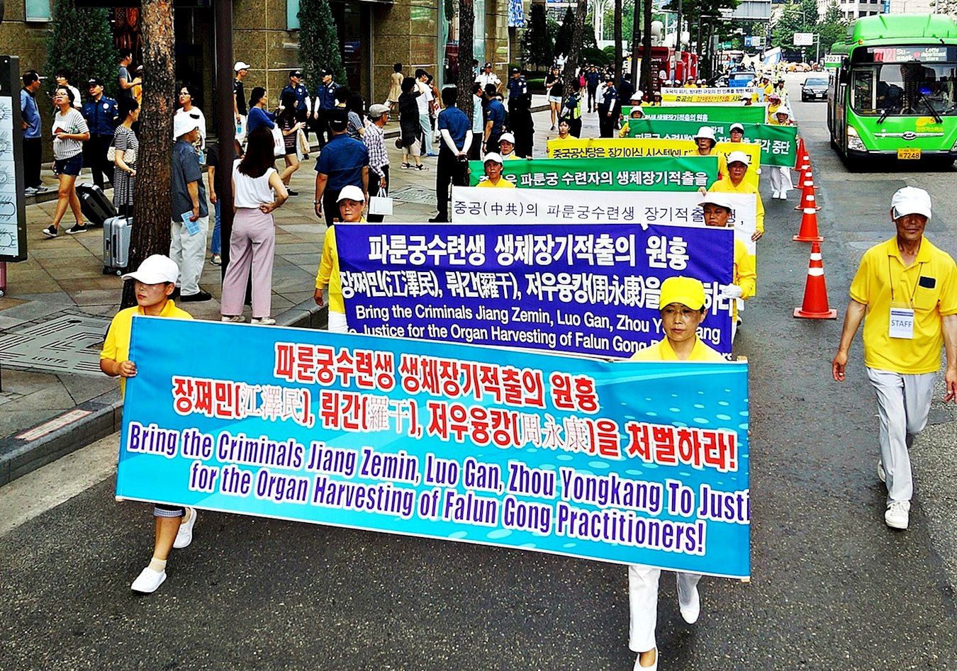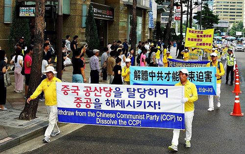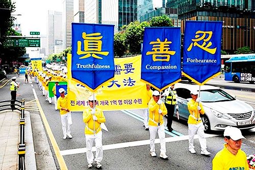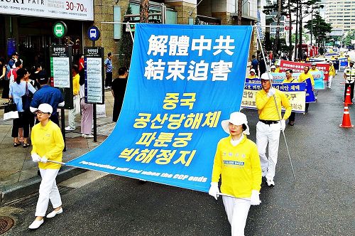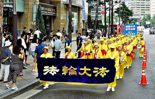 【明慧网二零一七年七月二十三日】二零一七年七月二十日,为了让更多的人关注在中国发生的对法轮功残酷的迫害,并认清中共的邪恶本质,来自韩国各地的部份法轮功学员及民主维权人士等聚集在首尔广场,举行法轮功反迫害十八周年集会及游行活动。在下午进行的一个半小时,3.8公里长的游行中,尽管天气特别炎热,但法轮功学员的游行队伍井然有序,天国乐团的合奏音乐震撼人心,大型莲花车、天国乐团、腰鼓队、真相横幅、悼念被迫害致死的队伍等,引起街店店主及路人们驻足观看,为了留下这历史的一瞬间,他们纷纷用手机拍摄。