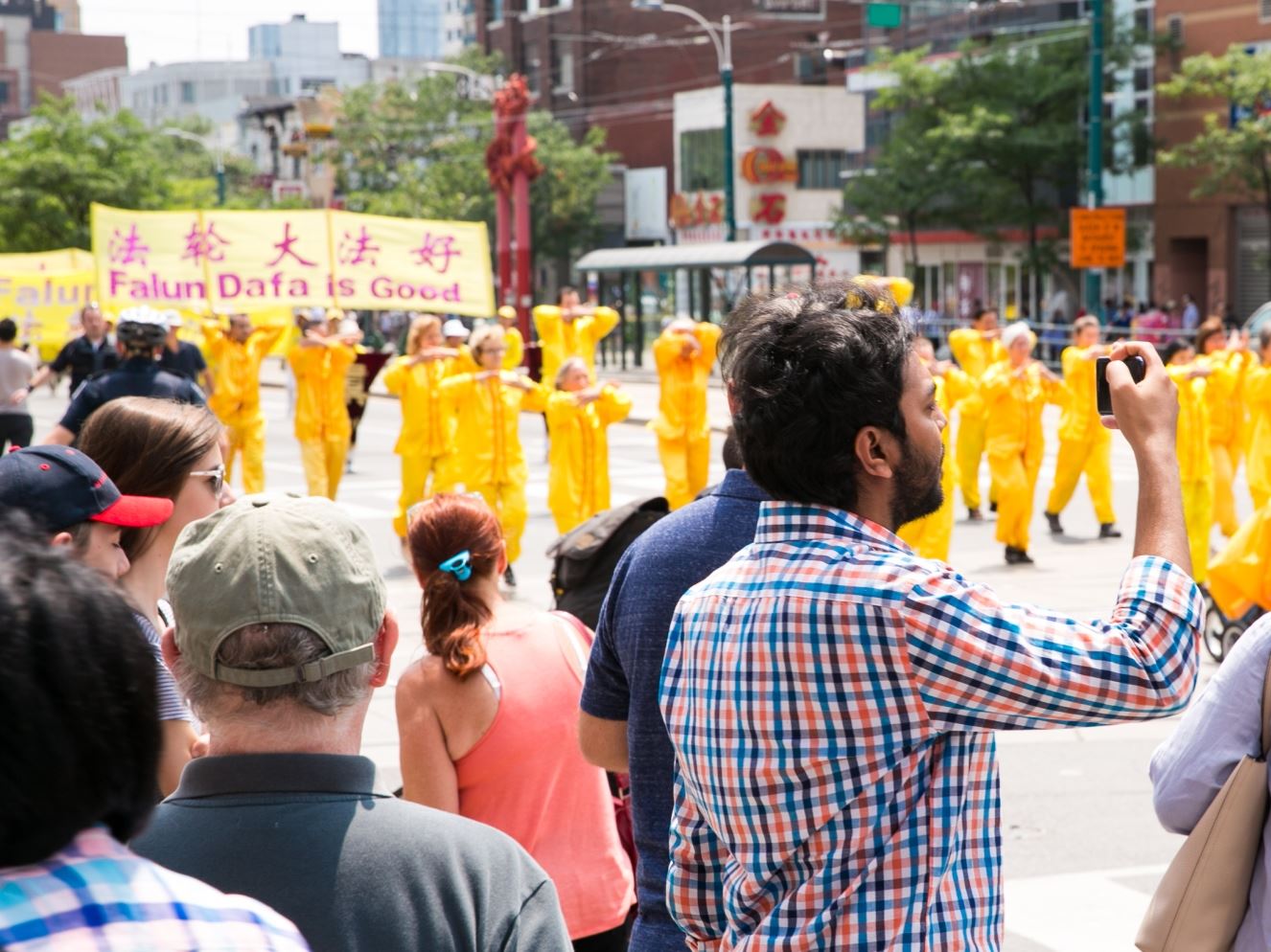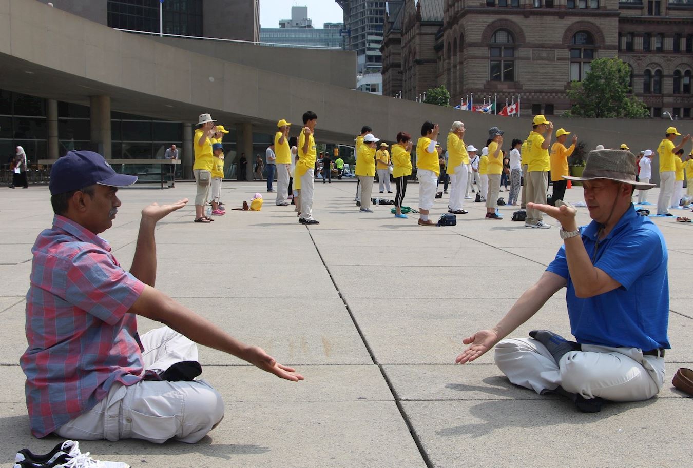 在早上的集体炼功现场,从斯里兰卡移民加拿大20多年的Joyakhanthan Yohadeva,跟着一位法轮功学员认真学习功法。他对记者说:“我在一个星期前,在多伦多的士嘉堡区经过,看到一个炼功点,当时吸引了我,我就拿了一张传单,知道了那是法轮功。而当我知道炼这个功法的团体在中国是受到迫害时,我当时的想法是,就算我不学法轮功,我也支持他们反迫害,因为那是非常不人道的事情。”