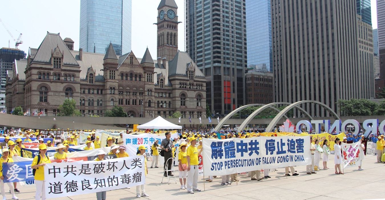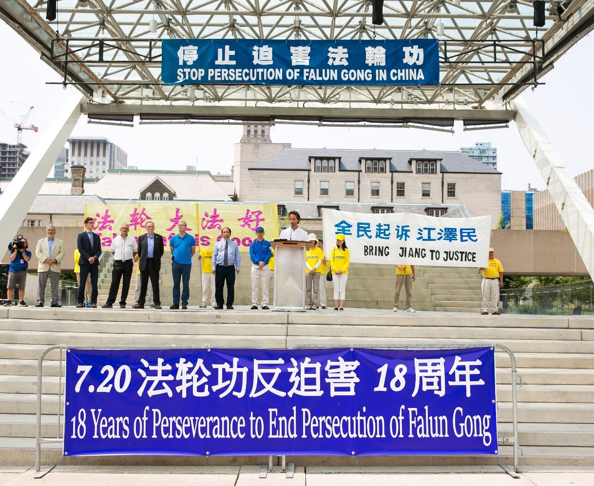 法轮功于一九九二年五月十三日由李洪志大师在吉林省长春市传出,以真、善、忍为准则的修炼大法在世界一百多个国家广为弘传,但是,中共从一九九九年七月二十日开始至今仍未停止对法轮功的迫害。法轮功学员十八年来在全球各地一直展开反迫害活动。反迫害十八周年集会 多伦多政要声援法轮功(图)
