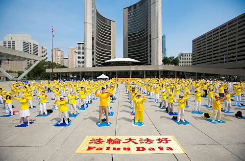![]() 图1~2:法轮功学员在多伦多市政厅的内森菲利普斯广场举行反迫害集会 |