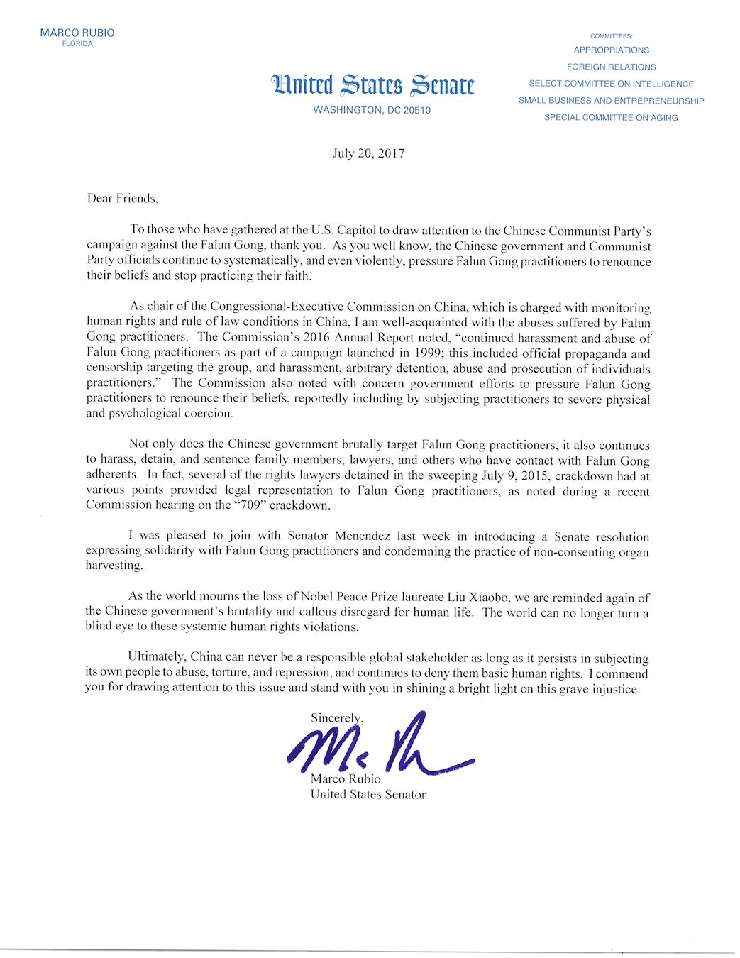 佛罗里达州联邦参议员马克·庐比奥(Marco Rubio)表示,作为美国国会及行政当局中国委员会(CECC,Congressional-Executive Commission on China)主席,他非常清楚法轮功学员遭受的迫害。该委员会2016年的年度报告中曾提到:“自1999年以来,法轮功学员持续受到骚扰和虐待,包括官方针对该群体的宣传和审查,折磨、无理关押、虐待和针对个人的诉讼。”该委员会对中共通过精神和肉体折磨来强迫法轮功学员放弃信仰的行径深感担忧。