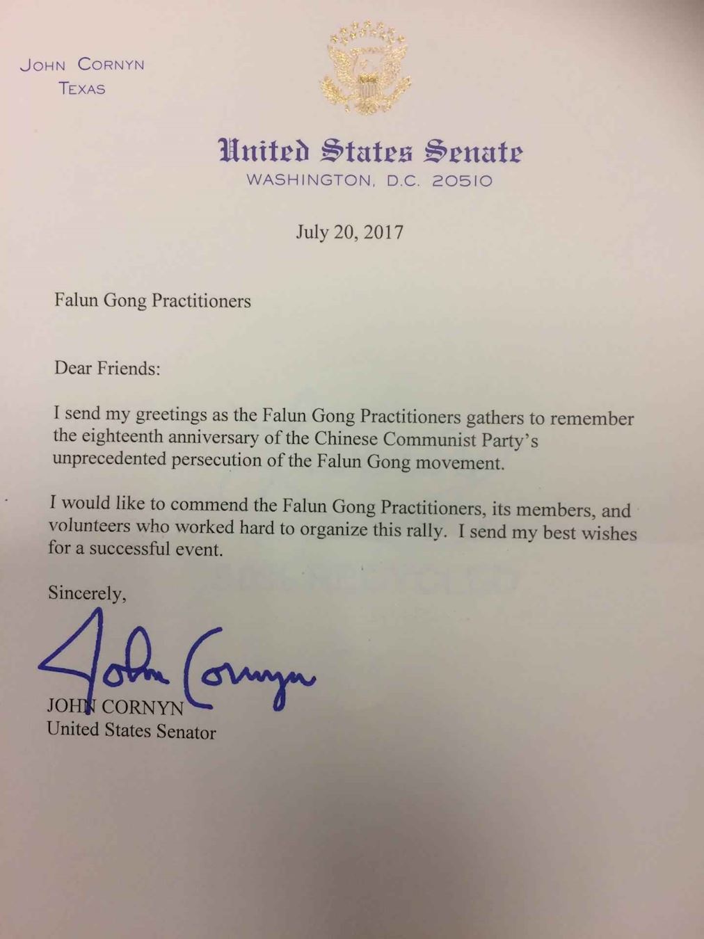德克萨斯州联邦参议员约翰·科恩(John Cornyn)在支持信中向法轮功修炼者致意。他表示,法轮功学员聚集在一起和平抗议中共发动的对法轮功前所未有的迫害。科恩赞扬法轮功修炼者和志愿者为组织“7.20”和平集会所作出的努力,希望活动成功举办。