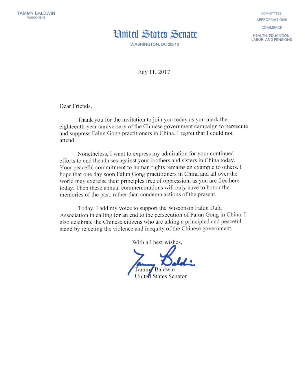 代表威斯康星州的联邦参议员塔米·鲍德温(Tammy Baldwin)认为,法轮功学员平和地争取人权的方式树立了典范。她说:“我想要表达对于你们的钦佩之情,你们为结束在中国的兄弟姐妹遭受的暴行而做出了不懈的努力。”