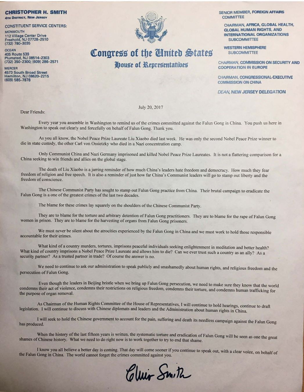 新泽西州的国会众议员克里斯·史密斯(Chris Smith)在支持信中表示,“我们决不能对暴行保持沉默,我们必须将罪恶之人绳之以法。全世界都不会忘记中共对法轮功犯下的罪恶。当未来的人们回看这十几年的历史,他们会看到,对法轮功的迫害是中国历史上最大的耻辱。我们现在需要做的,就是尽快结束这份耻辱,我们会继续请求美国政府公开表态支持人权和信仰自由。”他还表示,国会将继续举行人权听证会,起草人权相关法案。