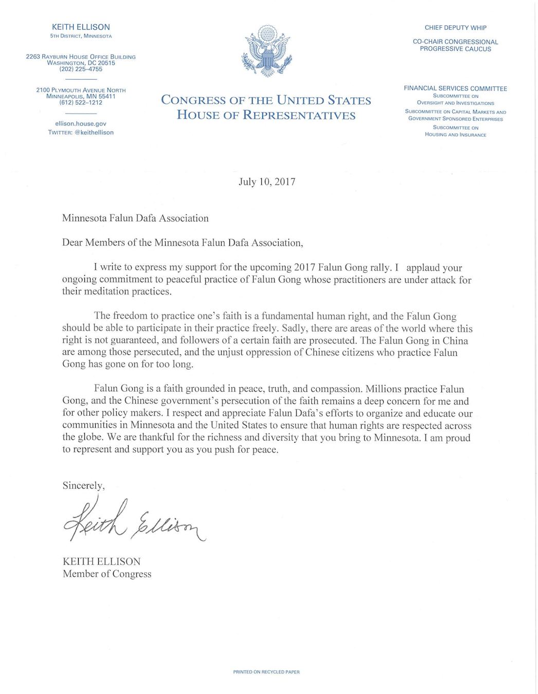 明尼苏达州国会众议员基思·埃利森(Keith Ellison)在信中说:“对修炼法轮功的中国公民的不公镇压已持续太长时间了。”他认为,信仰自由是基本人权,法轮功学员应当可以自由地修炼。