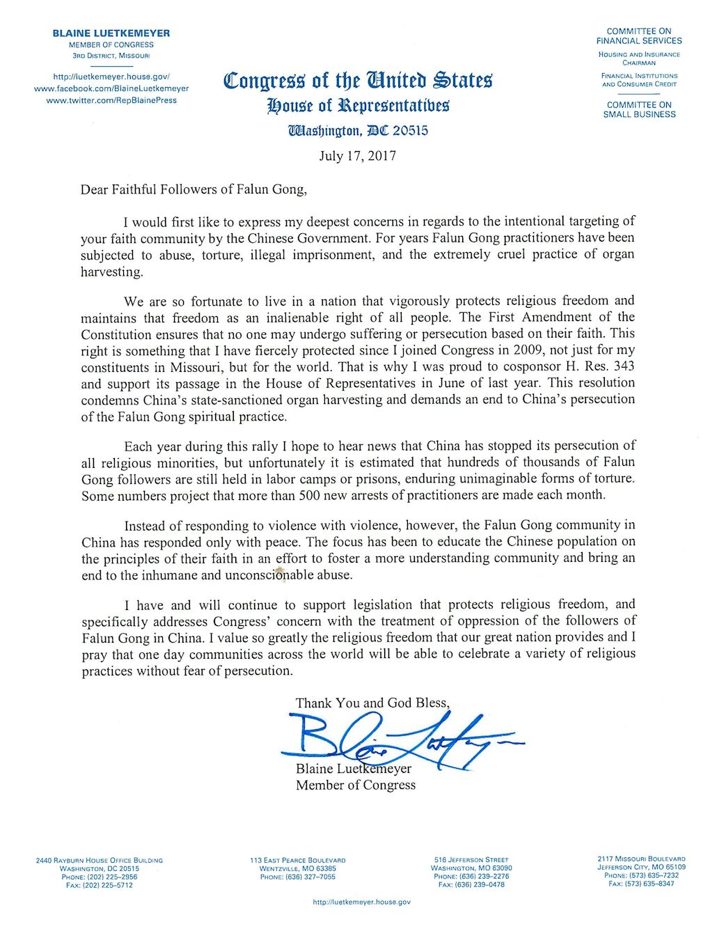 来自密苏里州的国会议员布莱因·卢克迈尔(Blaine Luetkemeyer)表示,每一年,他都希望中国的信仰人士不再受到迫害,然而情况却不容乐观。不过,卢克迈尔议员对于法轮功学员和平反迫害的精神表示赞许,他在信中说:“面对暴力,中国的法轮功学员没有以暴力还击,只是平和地面对。他们关心的是让中国人了解他们信仰的原则,增进理解,结束这场惨无人道的无理迫害。”