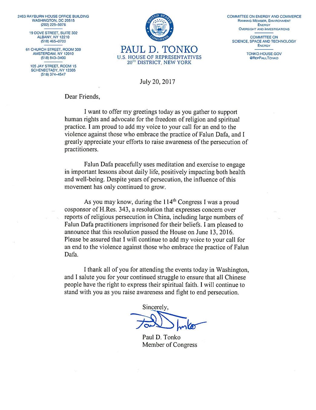 纽约州国会议员保罗·东科(Paul Tonko)是343决议案的发起人之一,决议案谴责中共强摘良心犯器官、要求中共立即停止迫害法轮功及释放关押的法轮功学员。他在支持信中写道:“我向你们致敬,你们为争取中国人表达精神信仰的权利而持续不断地努力着。我会继续和你们站在一起,让世界了解迫害、争取结束迫害。”
